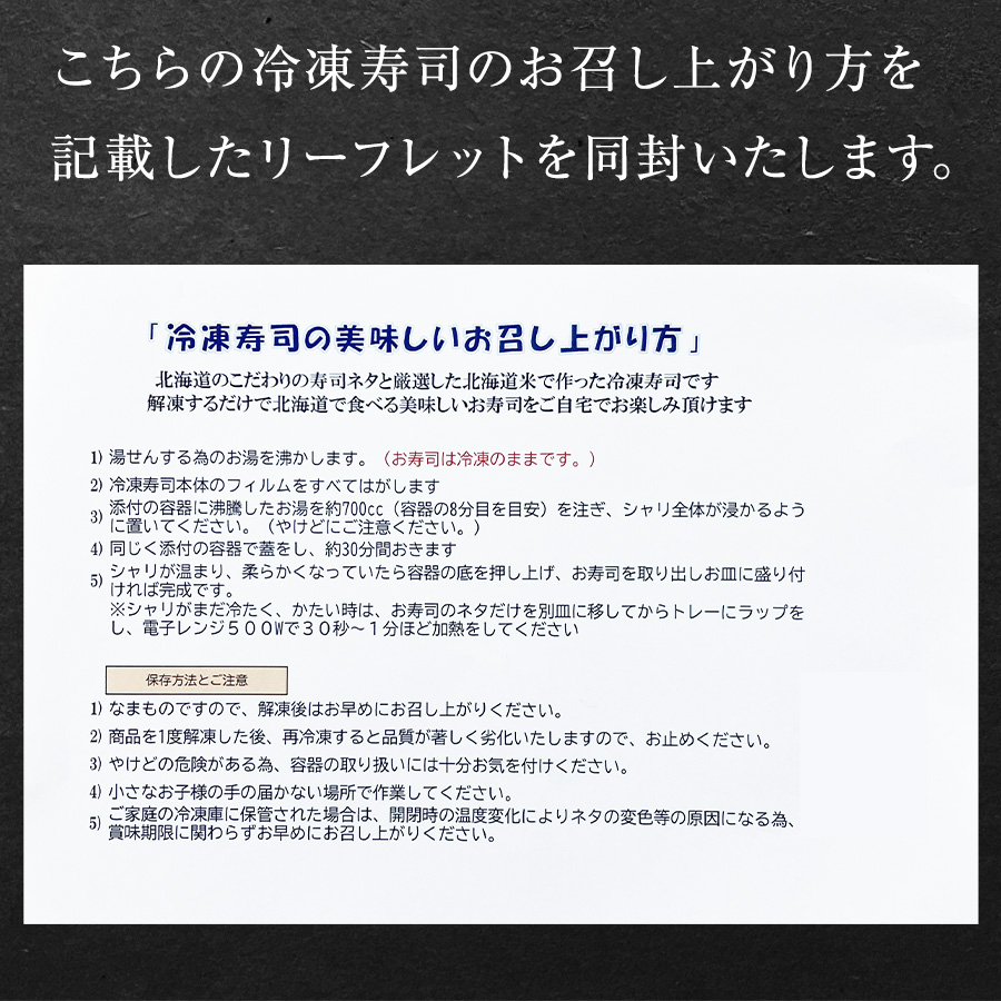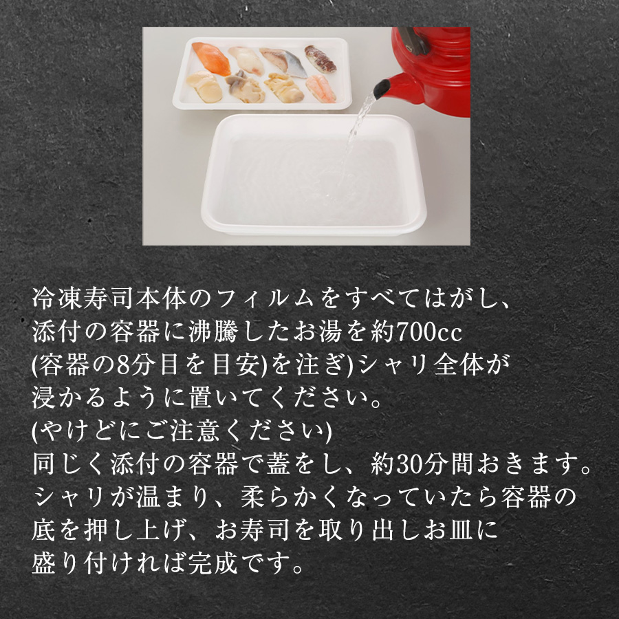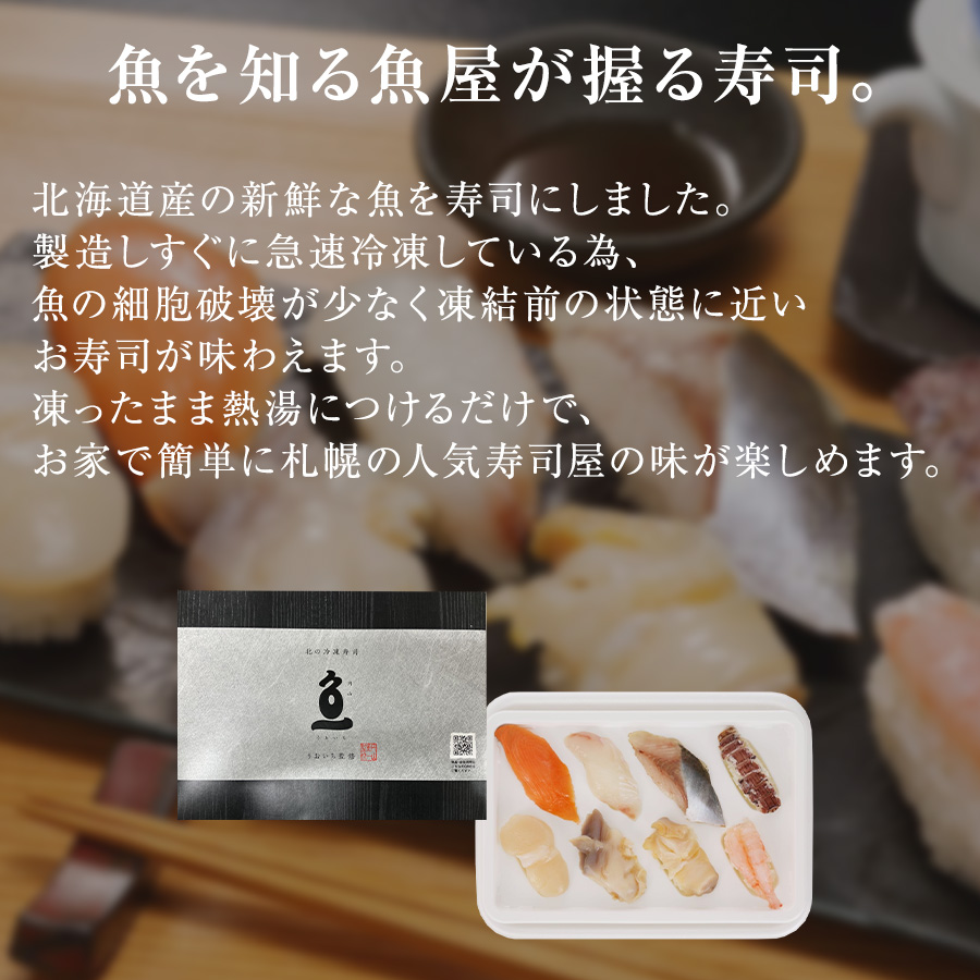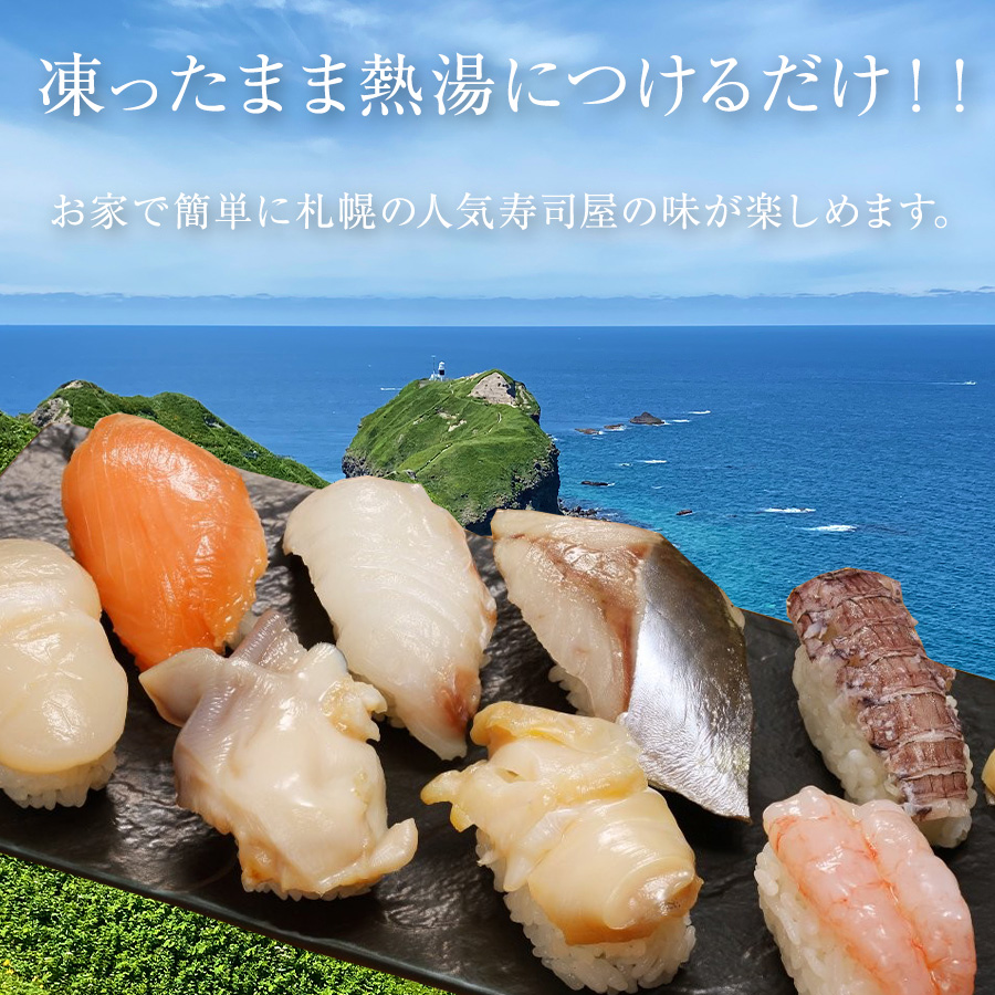 | 特徴 | 北海道産の新鮮な魚を寿司にしました。製造しすぐに急速凍結している為、魚の細胞破壊が少なく凍結前の状態に近いお寿司が味わえます。凍ったまま熱湯につけるだけで、お家で簡単に札幌の人気寿司屋の味が楽しめます。 |
