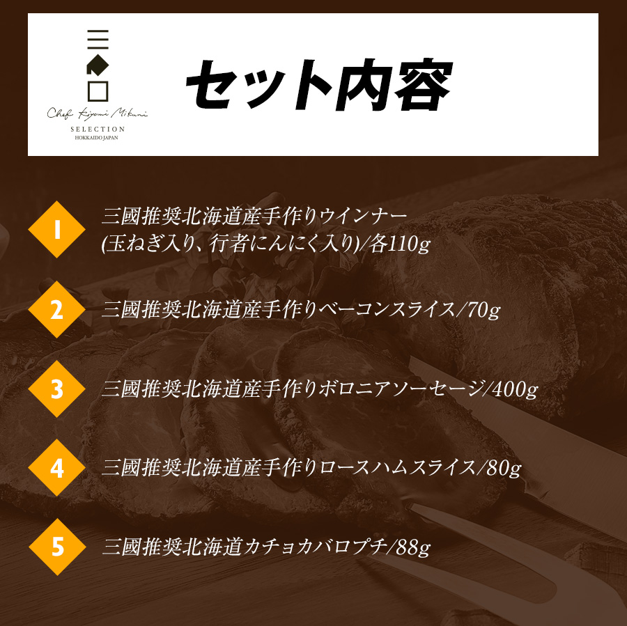 | 原材料名 | ●三國推奨北海道産手作りウインナー玉ねぎ入り 豚肉(北海道産)、豚脂肪、玉ねぎ、糖類(砂糖、水飴)、食塩、香辛料/調味料(アミノ酸等)、リン酸塩(Na)、酸化防止剤(ビタミンC)、発色剤(亜硝酸Na)、ビタミンB₁、(一部に豚肉を含む) ●三國推奨北海道産手作りウインナー行者にんにく入り 豚肉(北海道産)、豚脂肪、行者にんにく、糖類(砂糖、水飴)、食塩、香辛料/調味料(アミノ酸等)、リン酸塩(Na)、酸化防止剤(ビタミンC)、発色剤(亜硝酸Na)、ビタミンB₁、(一部に豚肉を含む) ●三國推奨北海道産手作りベーコンスライス 豚肉(北海道産)、糖類(砂糖、水飴、ぶどう糖)、食塩/リン酸塩(Na)、調味料(アミノ酸)、酸化防止剤(ビタミンC)、香辛料抽出物、発色剤(亜硝酸Na)、ビタミンB₁、(一部に豚肉を含む) ●三國推奨北海道産手作りロースハムスライス 豚肉(北海道産)、糖類(砂糖、水飴、ぶどう糖)、食塩/リン酸塩(Na)、調味料(アミノ酸)、酸化防止剤(ビタミンC)、香辛料抽出物、発色剤(亜硝酸Na)、ビタミンB₁、(一部に豚肉を含む) ●三國推奨北海道産手作りボロニアソーセージ 豚肉(北海道産)、豚脂肪、糖類(砂糖、水飴)、食塩、香辛料/調味料(アミノ酸等)、リン酸塩(Na)、酸化防止剤(ビタミンC)、発色剤(亜硝酸Na)、ビタミンB₁、乳化剤(カゼインNa)、(一部に乳成分・豚肉を含む) ●三國推奨北海道カチョカバロプチ 生乳(北海道)、食塩 |