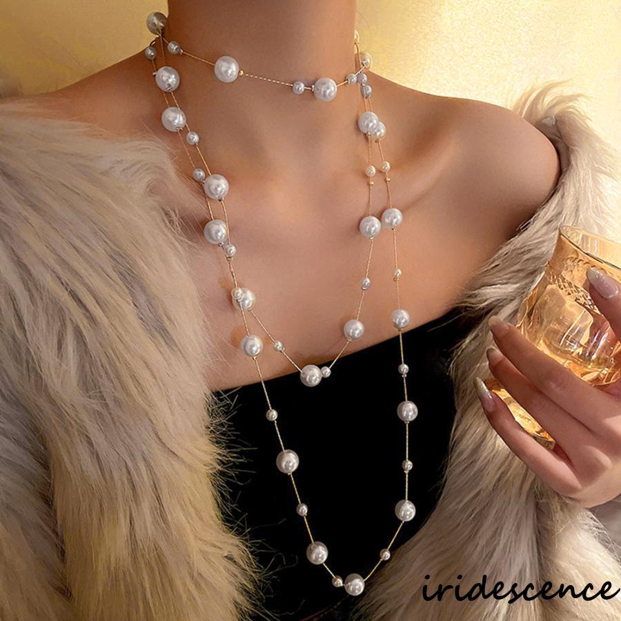 フェイクパールと華奢なチェーンを連なったデザインがで女性らしい雰囲気のロングネックレスです