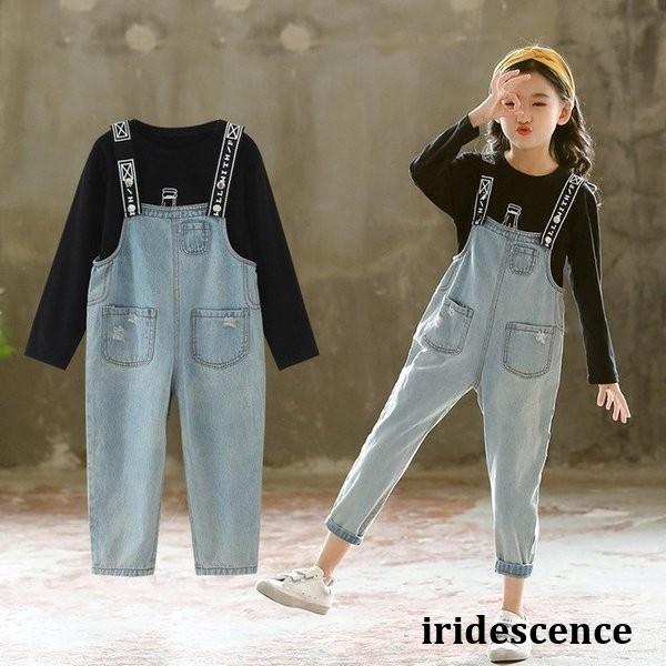 韓国子供服 女の子 デニム サロペットパンツ 2点セット 長袖 Tシャツ + サロペット 春秋服 子供トップス オーバーオール 女児