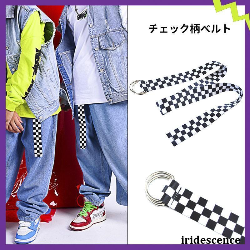 ブラックホワイトチェック柄ベルト ダンス衣装 キッズ ヒップホップ リングベルト ロゴテープ ダンスファッション