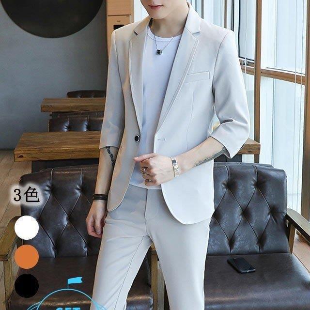 7分袖ジャケット+半袖Tシャツ+パンツ 薄手 3色 3点セット夏 カジュアル メンズ スーツ スーツセット フォーマル OL 通勤 発表会 演奏会 成人式 紳士服