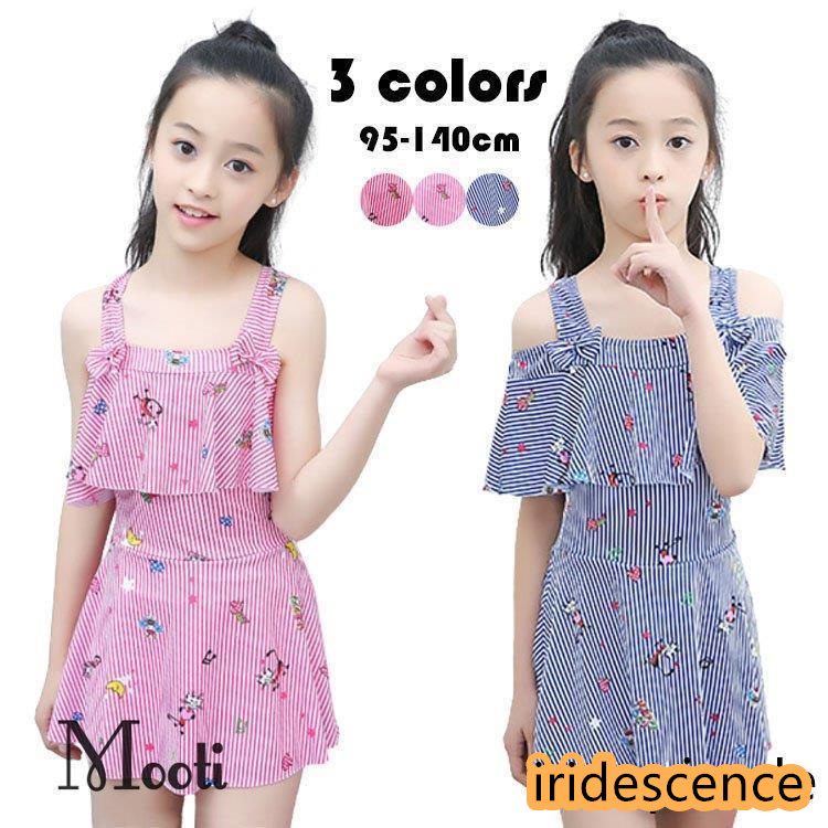 子供服 水着 ワンピース キッズ 女の子 kids 肩出し プリント オールインワン おしゃれ 可愛い こども服 ジュニア 女児 小学生 中学生 プール 海水浴 温泉 3色
