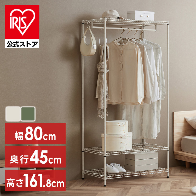 (検索用:スチールラック・幅80・収納ラック・3段・収納棚・ハンガーラック・コートハンガー・パイプハンガー・ワードローブ・オープンラック・メタルラック・メタルシェルフ・棚板高さ調節・衣類収納・4967576706780・4967576706797・アイリスオーヤマ)