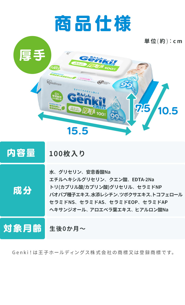 (検索用:おしりふき・厚手・大判・100枚入・ふた付・純水99%・水分たっぷり・無香料・ノンアルコール・保湿成分配合・赤ちゃん・ベビー・手口ふき・ウェットティッシュ・おしり拭き・お尻拭き・Genki・大判サイズ・4967576792196・アイリスオーヤマ)