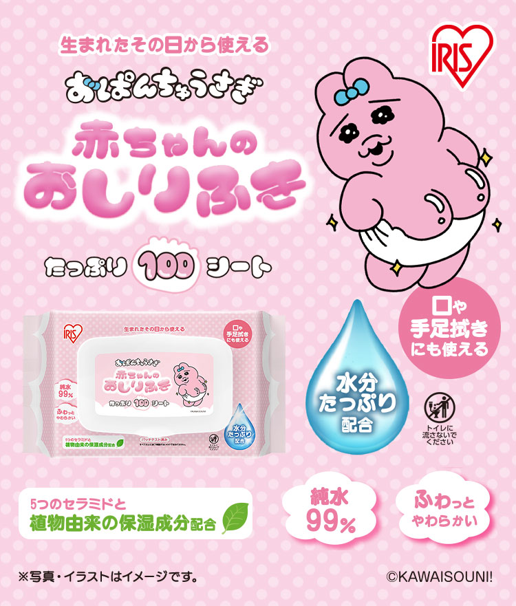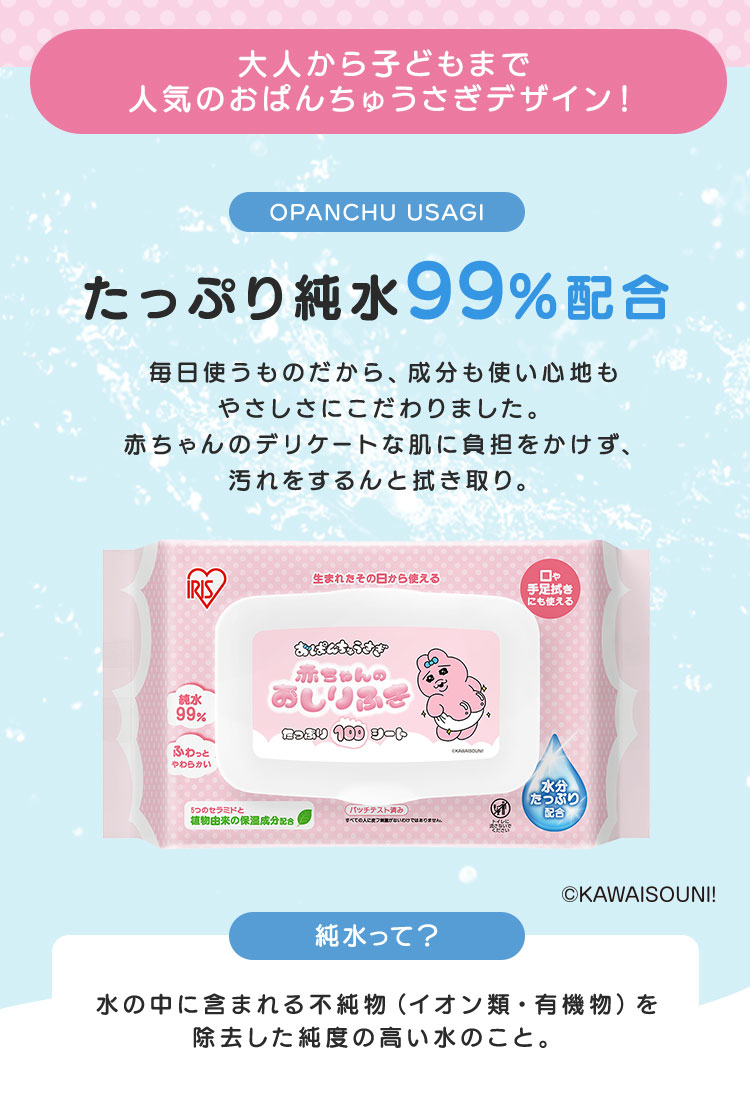 (検索用:おしりふき・厚手・大判・100枚入・ふた付・純水99%・水分たっぷり・保湿成分配合・おぱんちゅうさぎ・おしり拭き・新生児・赤ちゃん・ベビー・ウェットティッシュ・持ち運び・手口ふき・体拭き・お尻拭き・4967576802628・アイリスオーヤマ)
