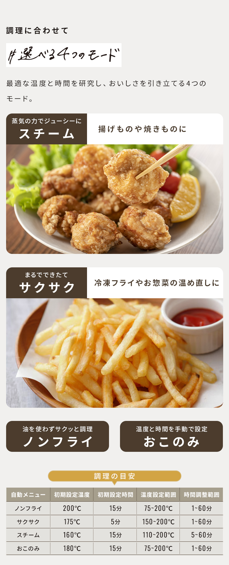 調理に合わせて選べる4つのモード[スチーム/サクサク/ノンフライ/おこのみ]を搭載しています。