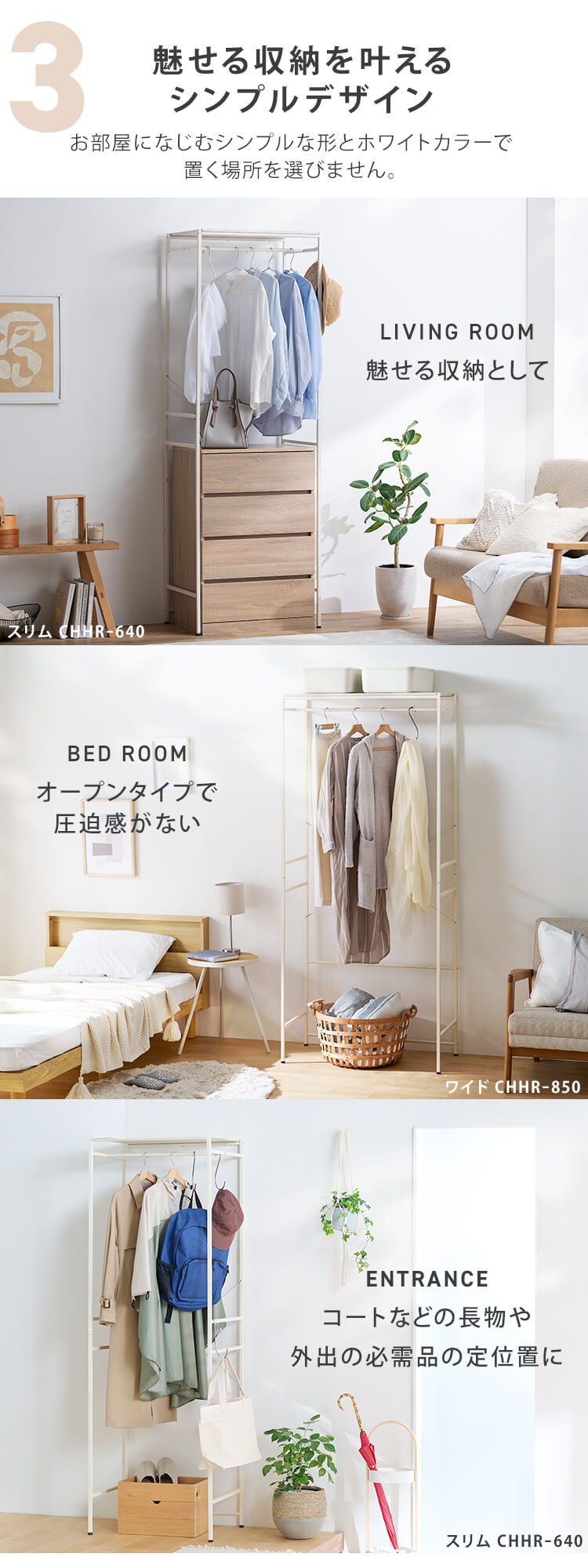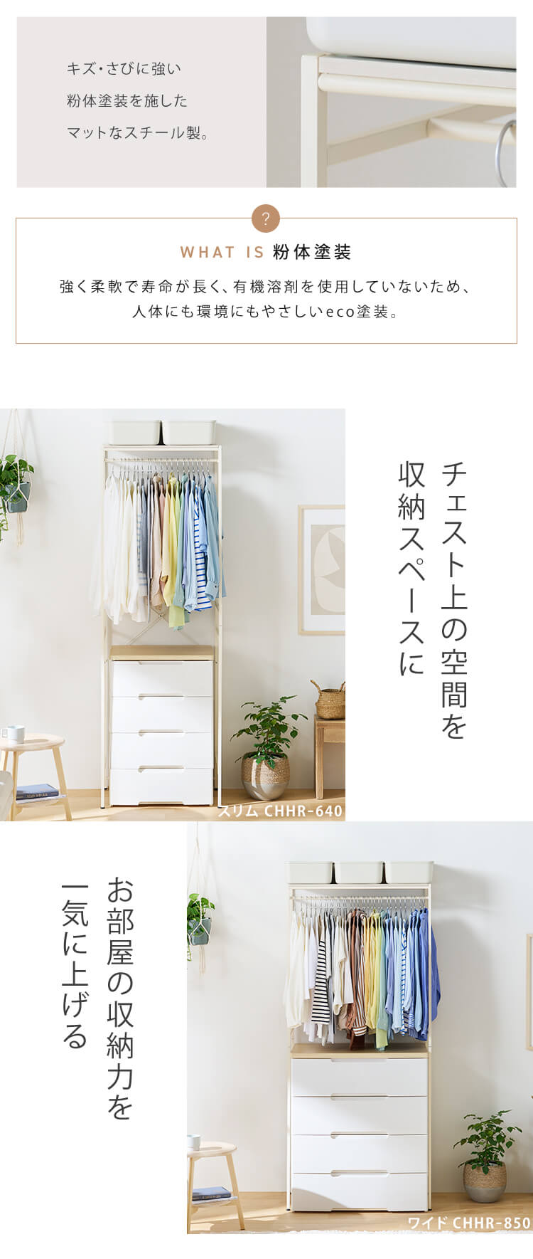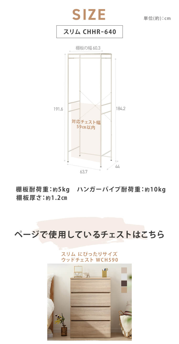 チェストの幅によってコートなど、長物も収納可能。