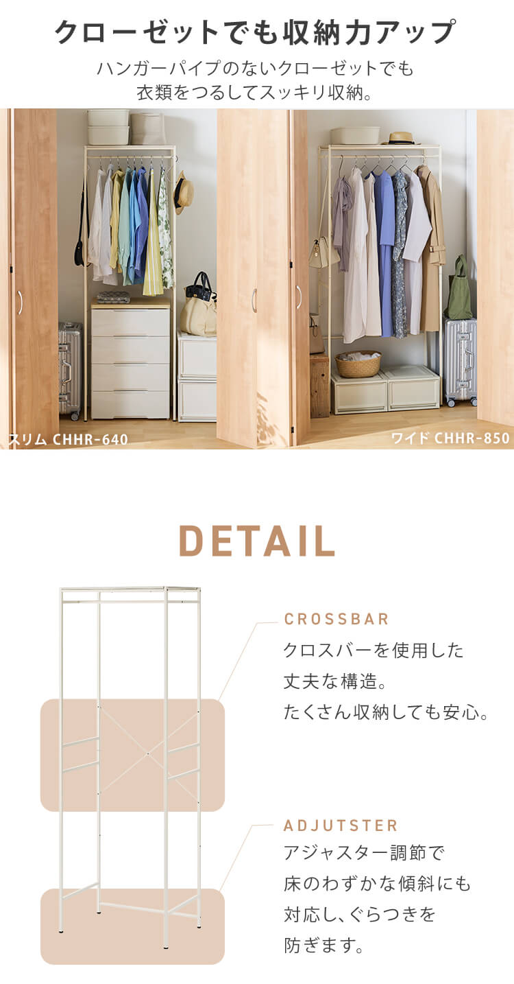 ハンガーパイプのないクローゼットでも衣類をつるしてスッキリ収納。