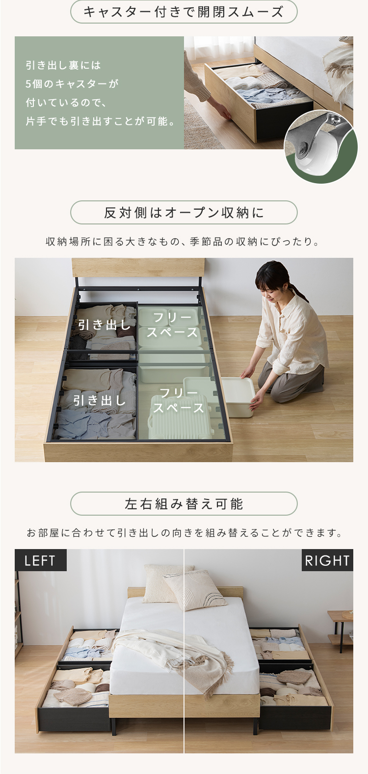 引き出し裏にはキャスターがついているので、片手でも引き出すことが可能。