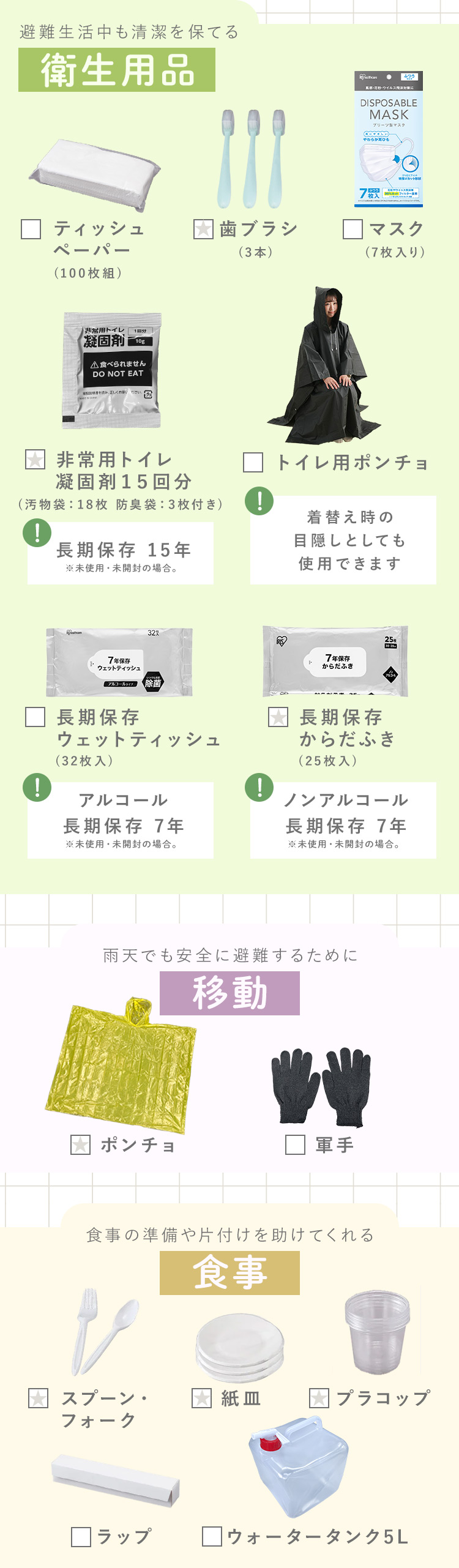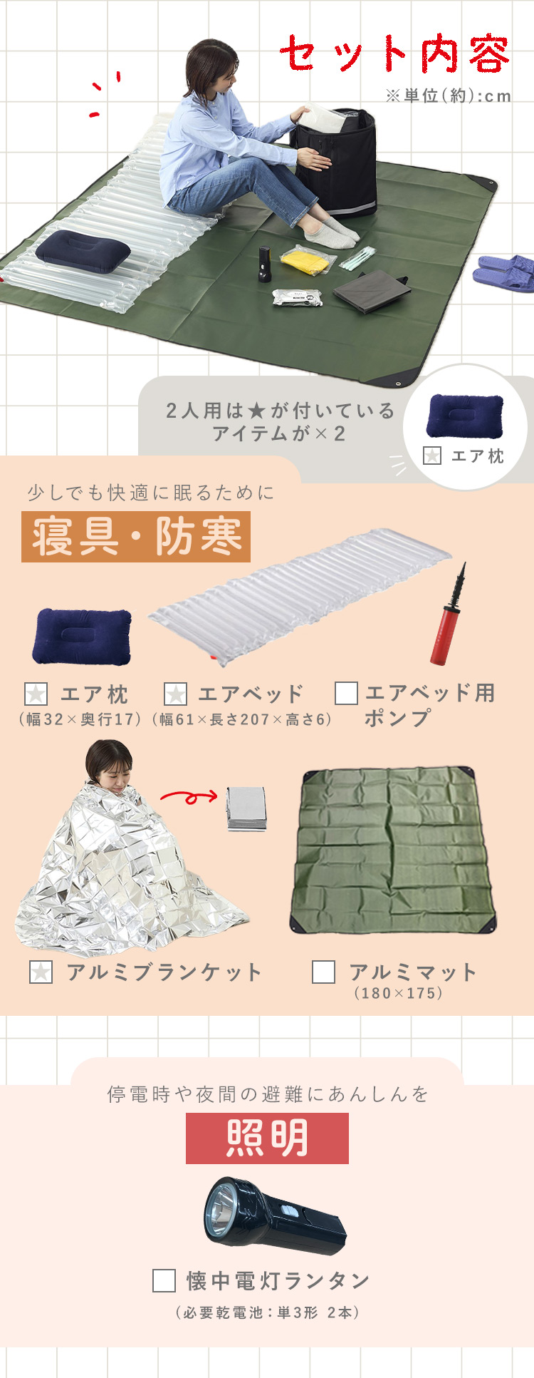 物資供給やライフラインが復旧するまでの生活をサポートするため、睡眠環境や排泄、衛生面などに配慮した用品を備えています。
