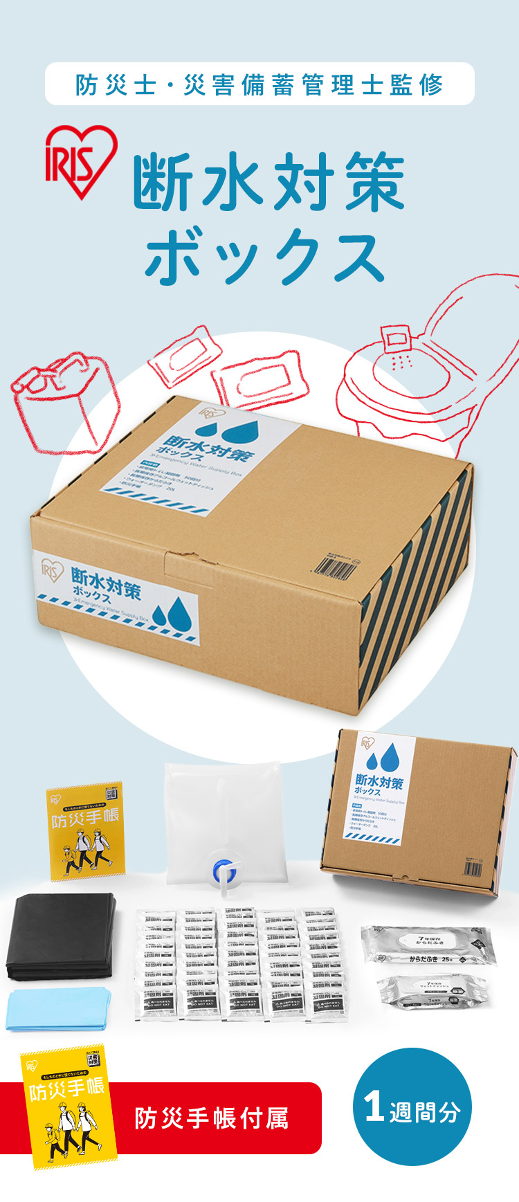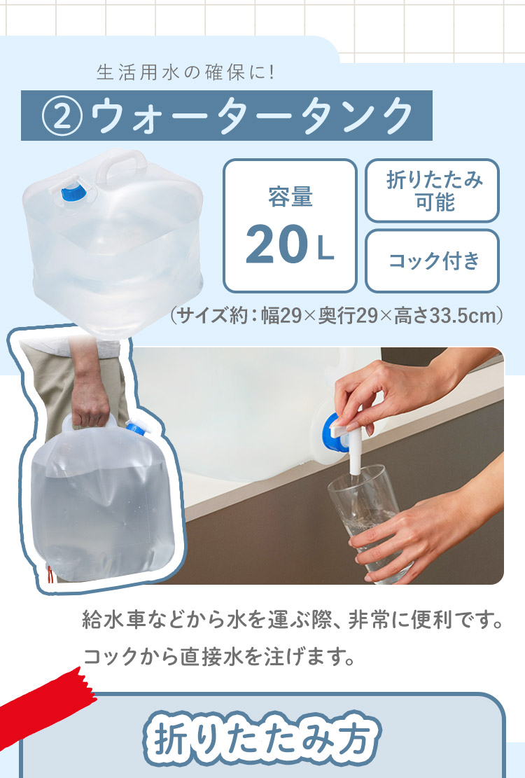 約1週間分の断水対策をサポートするセットです。