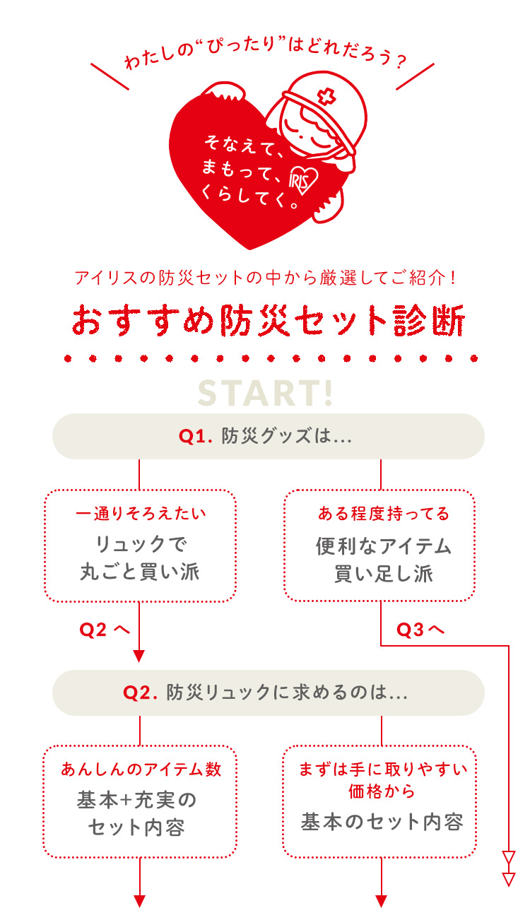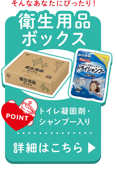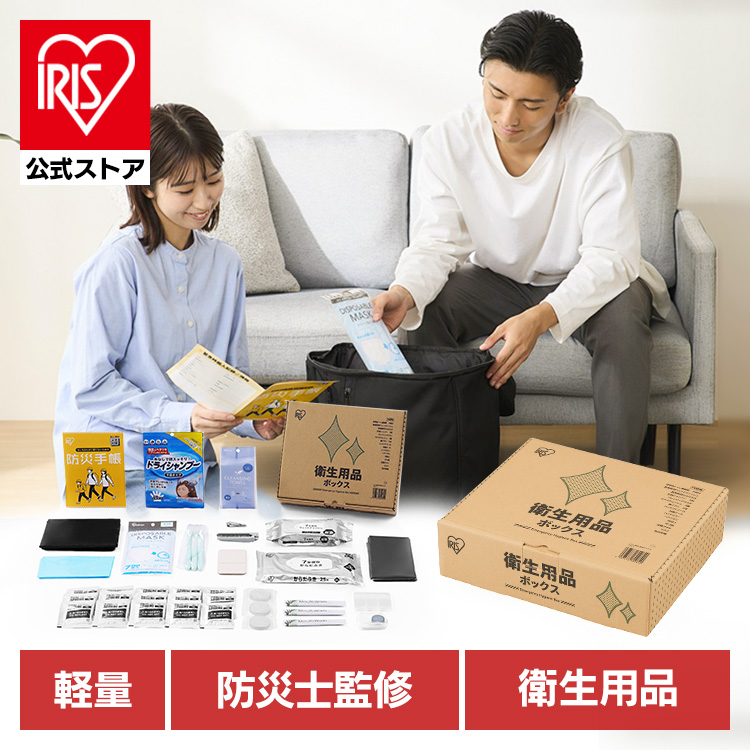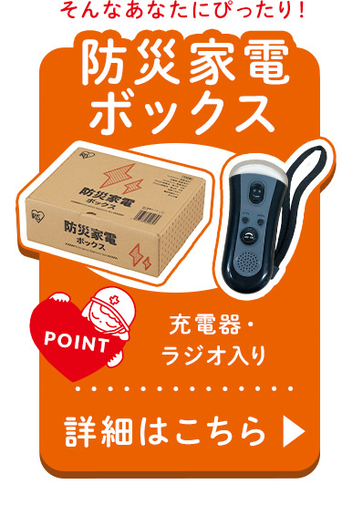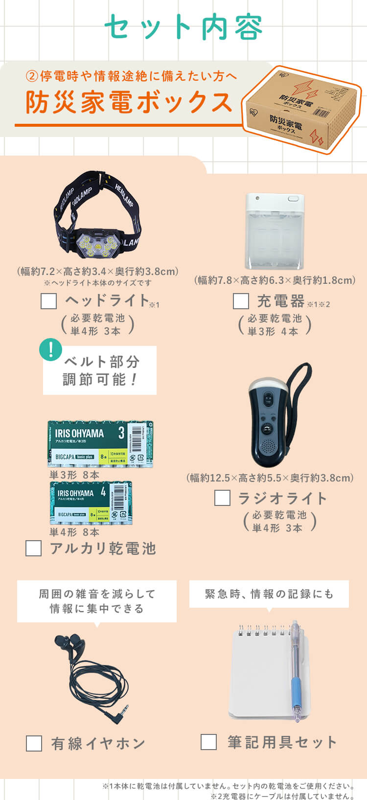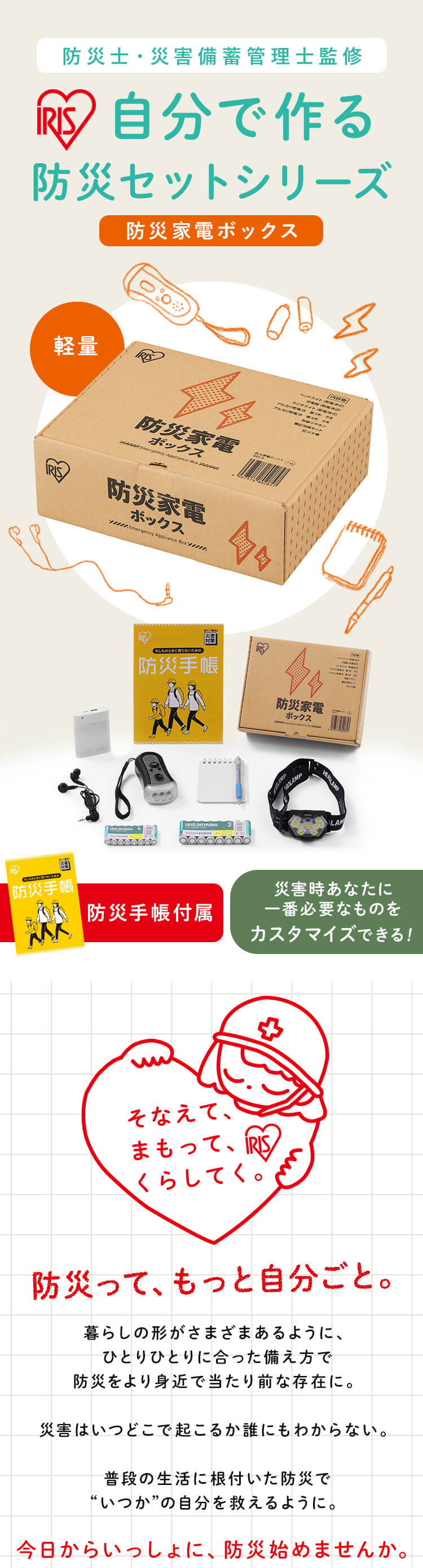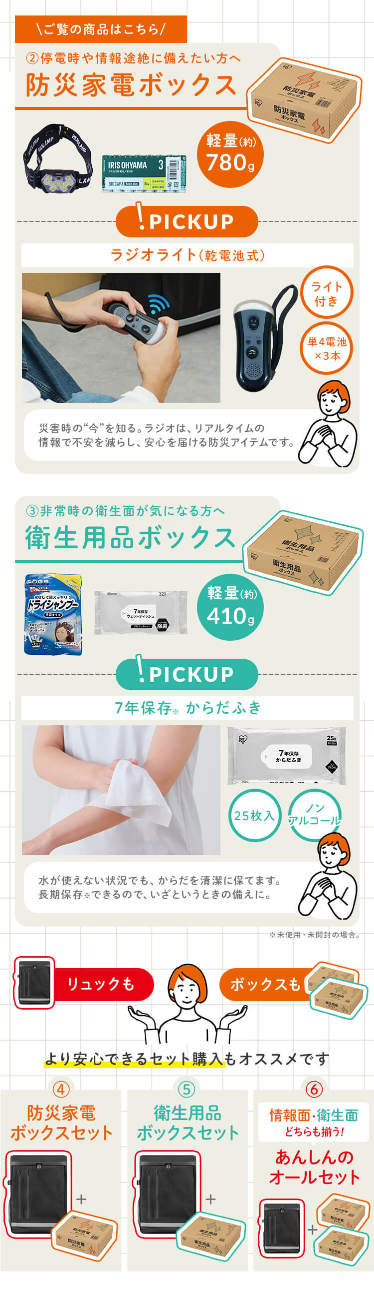 「基本の防災リュック」「衛生用品ボックス」「防災家電ボックス」