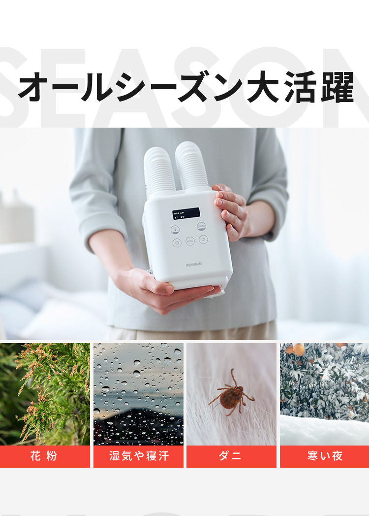 (検索用:布団乾燥機・カラリエ・ツインノズル・コンパクト・ハイパワー・速乾・小型・軽量・ダニ対策・あたため・冬モード・布団乾燥・靴乾燥・汗・湿気・梅雨・花粉対策・オールシーズン・4967576811996・4967576812009・4967576812016・アイリスオーヤマ)