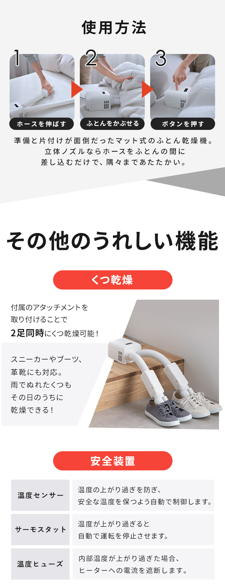 ツインノズルだから、2つのふとん・くつを同時にあたため、乾燥できます。