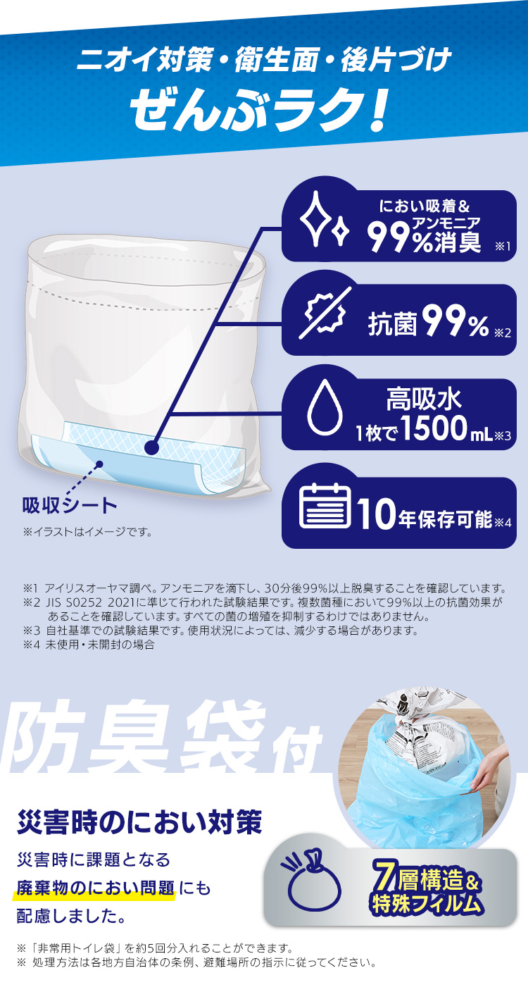 災害時や断水時などのトイレが使えない場面に加え、介護・アウトドアシーンでも役立つ非常用トイレ袋です。