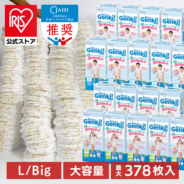 (検索用:まとめ買い大容量・オムツ・L・378枚・ビッグ・324枚・パンツ・ふわもちタッチ・肌に優しい・横モレ・最長12h・さらさら・動物柄・おむつ・紙おむつ・ゲンキ・Genki・Lサイズ・BIG・アイリスオーヤマ・4967576832380・4967576832397・アイリスオーヤマ)