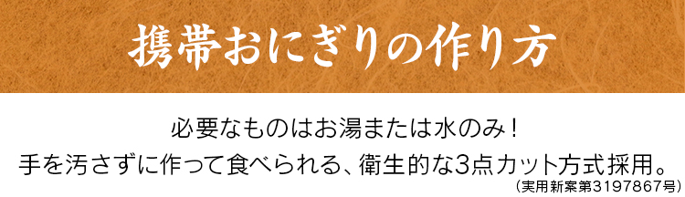 お湯または水を入れるだけで具材の旨味がギュッとおいしい三角形のおにぎりができあがります。