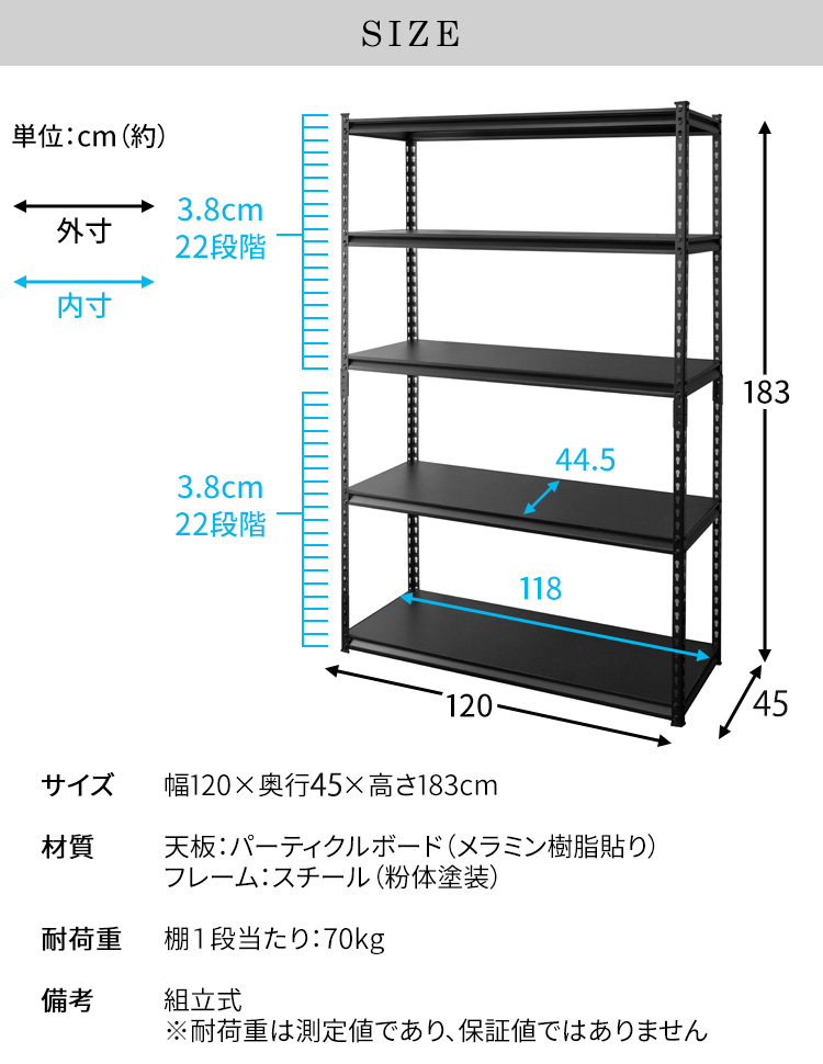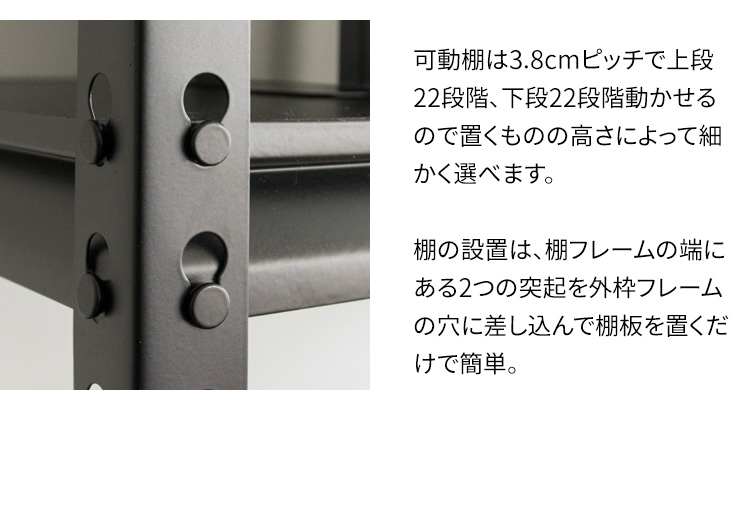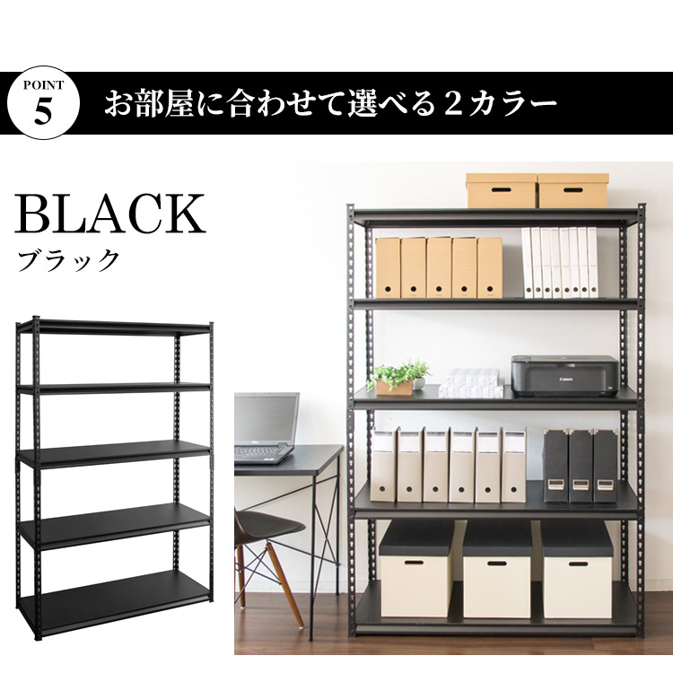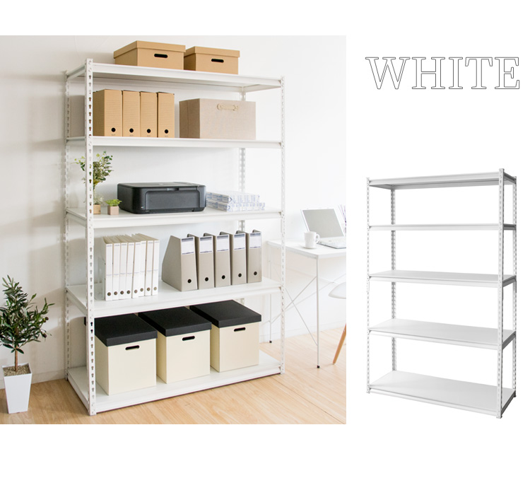 お好みの位置に設置できる5枚の可動棚が付いたスチールラック。
