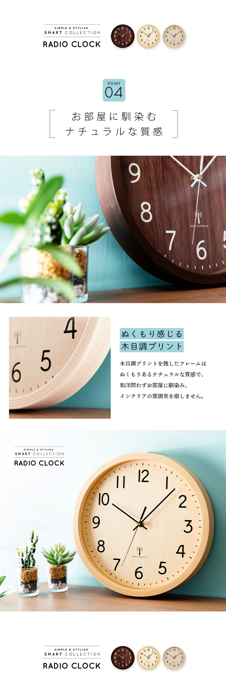 時計 壁掛け おしゃれ 北欧 インテリア 電波式 軽量 木目調 薄型 壁掛け時計 掛け時計 30cm PWCRR-30-C