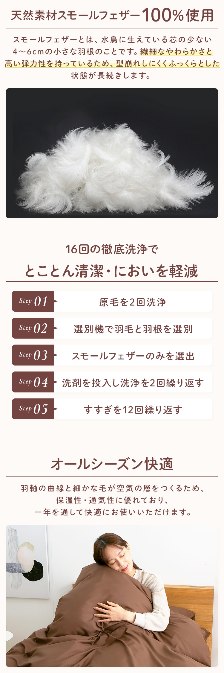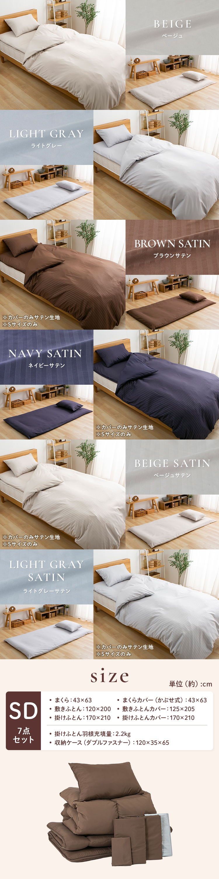 厳選スモールフェザー100%、掛け布団・敷き布団・枕・枕カバー・掛け布団カバー・敷布団カバー+収納袋のお得なセットです。