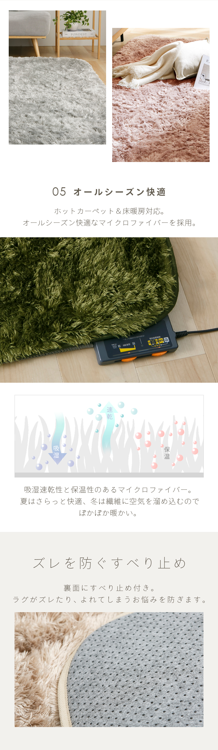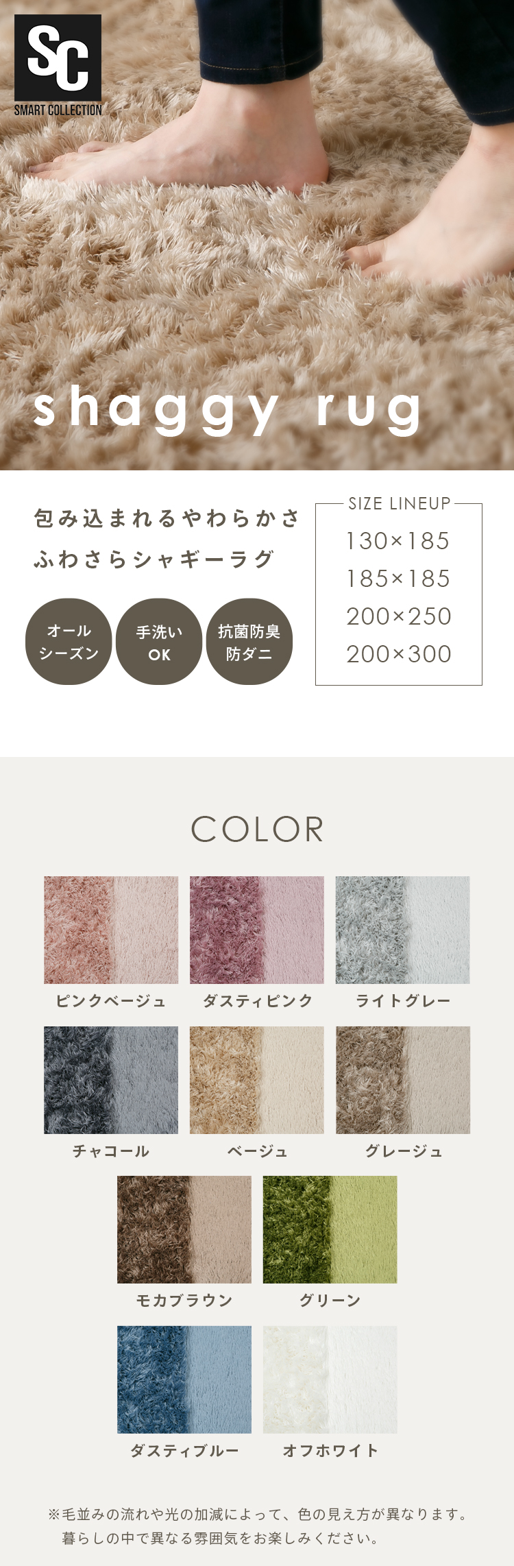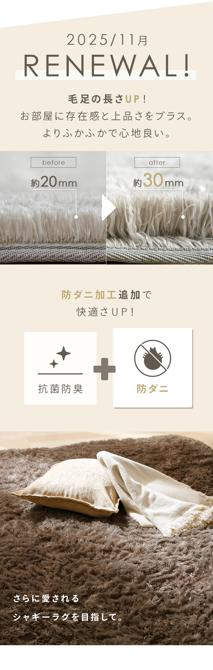 ラグの毛足が30mmの長毛パイルにリニューアルで、手足を優しく包み込んでくれるようなボリューム感です。
