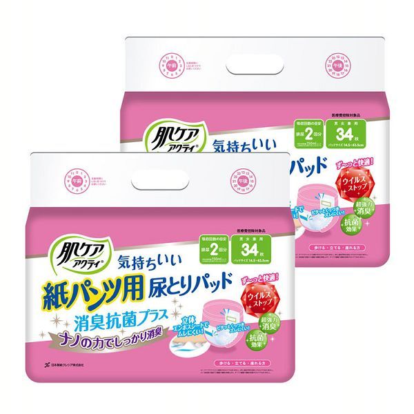 2個セット 大人用紙おむつ 肌ケア アクティ 紙パンツ用尿とりパッド 消臭抗菌プラス 2回分吸収 34枚 日本製紙クレシア
