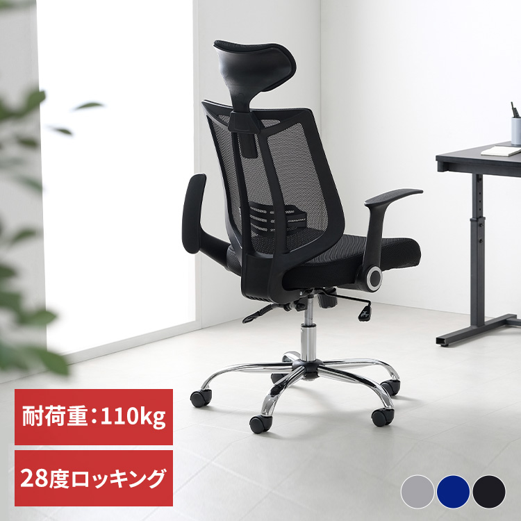 ヘッドレストとリクライニング調整ができるメッシュバックオフィスチェアです。
