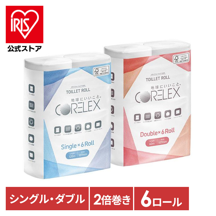 トイレットペーパー シングル ダブル 2倍巻 120m 60m 6ロール トイレットロール コアレックス CORELEX 再生紙 まとめ買い 備蓄