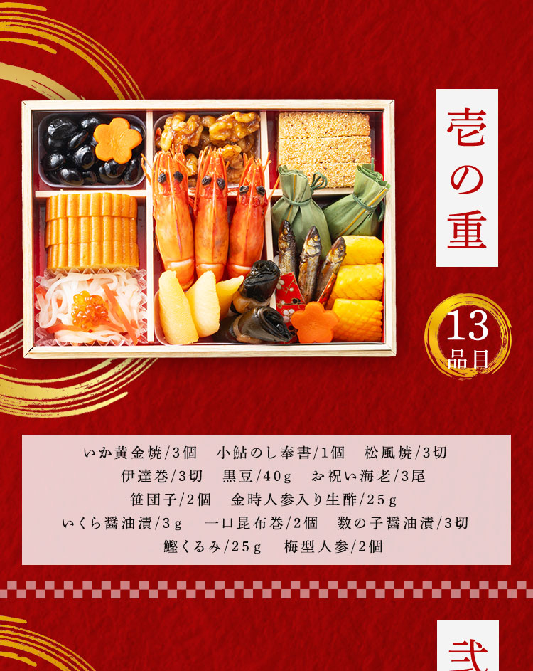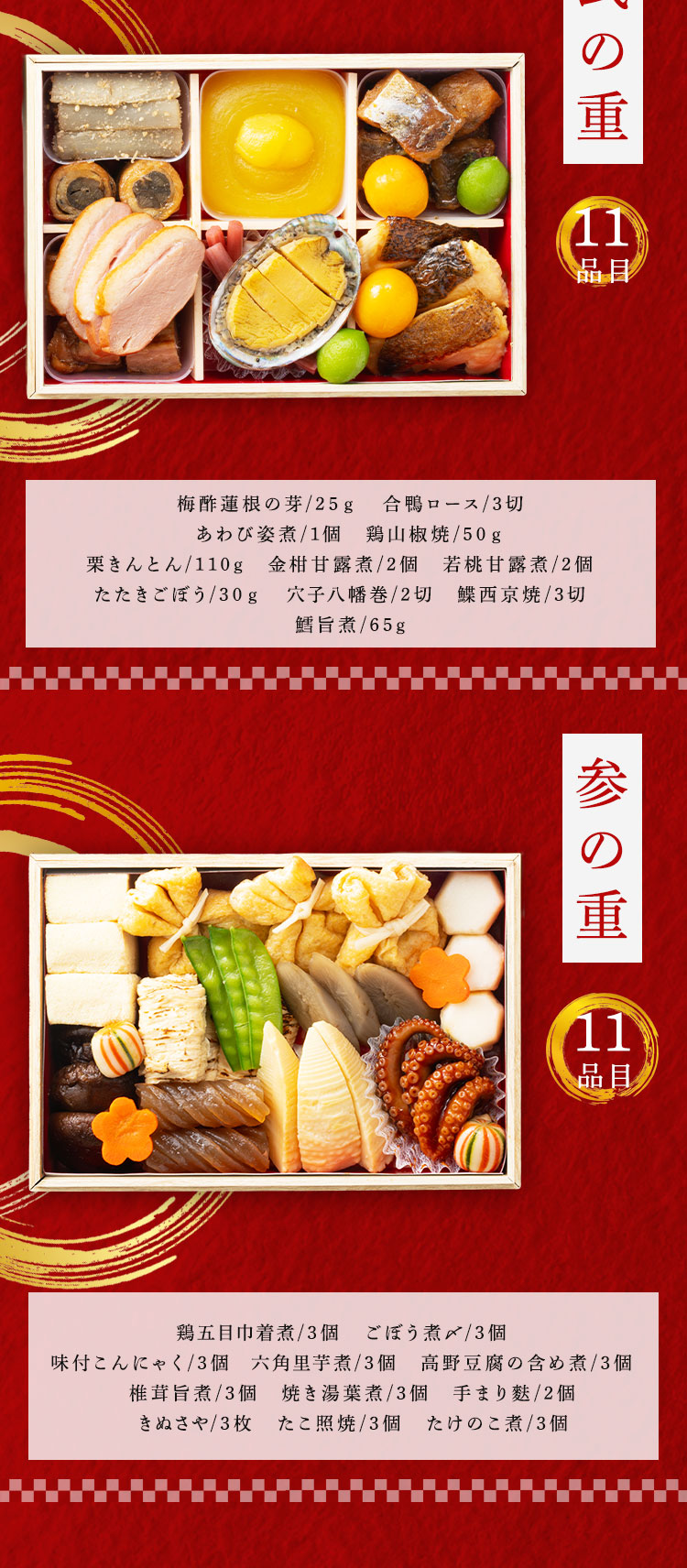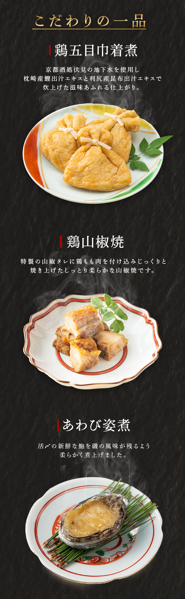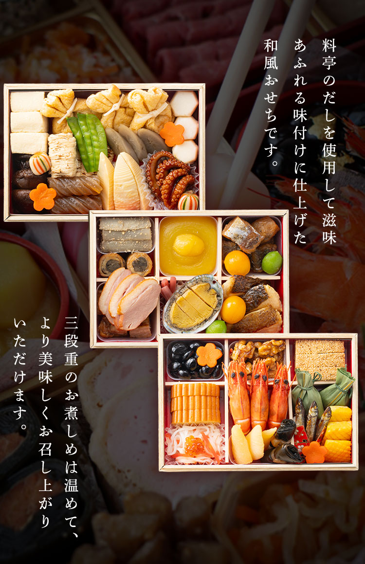 素材を生かし、滋味あふれる味付けに仕上げた和風おせちです。素材の味わいを生かし、見た目も鮮やかに盛りつけました。三段重のお煮しめは温めて、より美味しくお召し上がりいただけます。