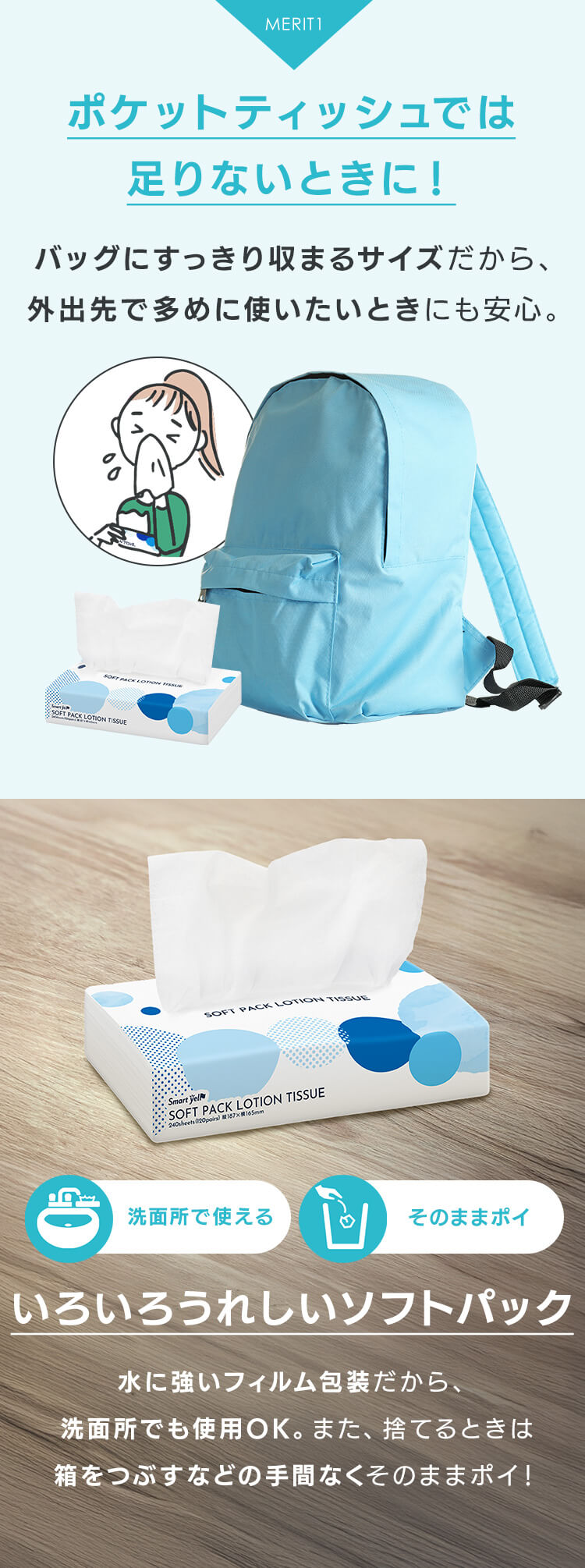 コンパクトで持ち運びが簡単なソフトパックティッシュです。