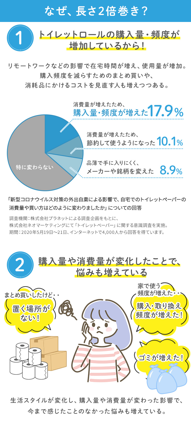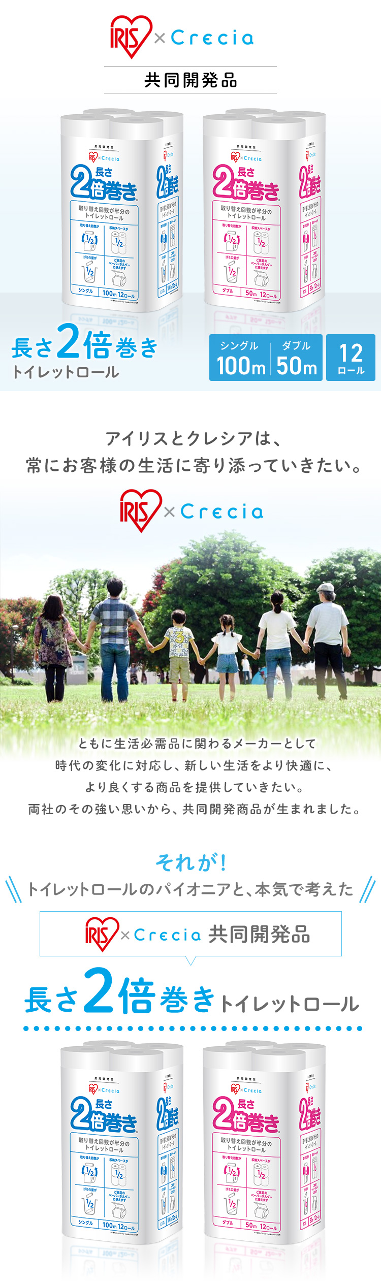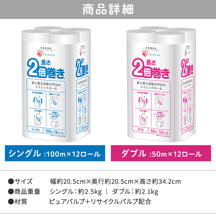 1ロールで2ロール分の長さの、2倍巻き(※)トイレットロール。