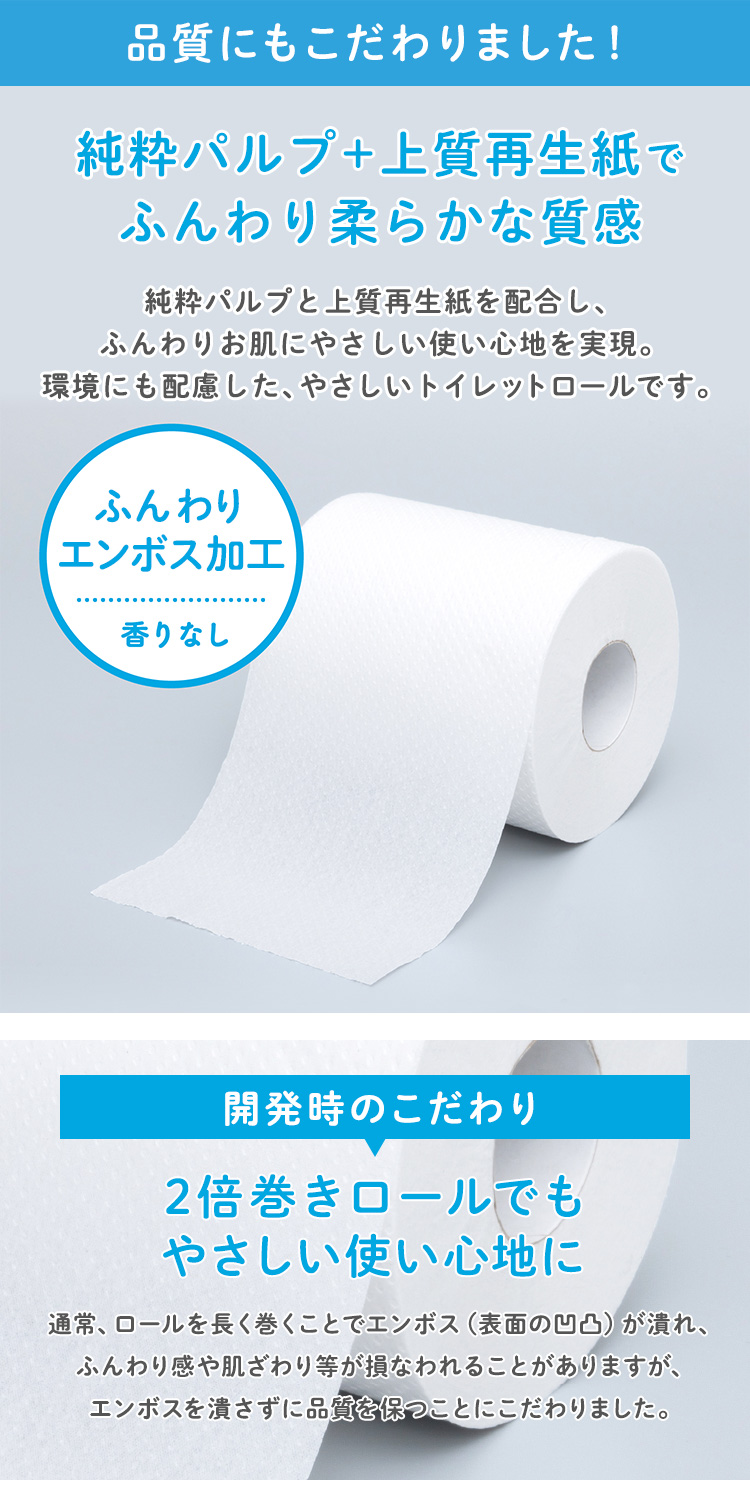 純粋パルプと、上質なリサイクルパルプを配合した原料のトイレットペーパーです。