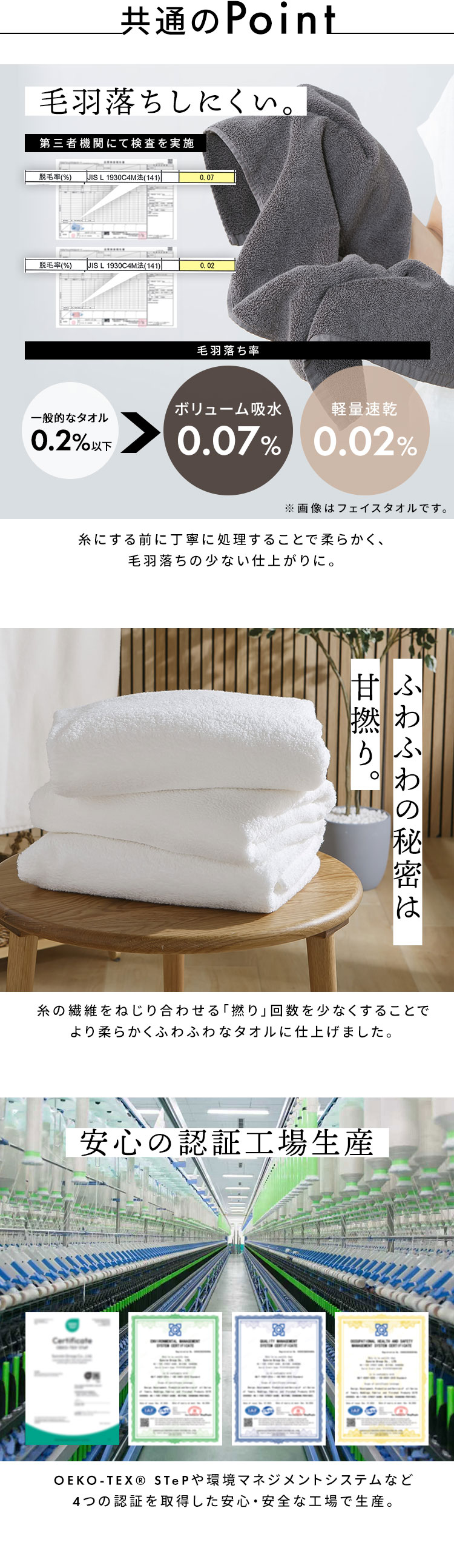 綿とポリエステルを混合させるているから、吸水性を保ちながらも速乾性を実現。