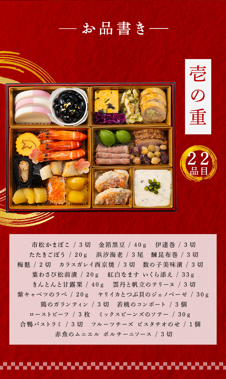 フルーツチーズ ポルチーニソース、市松かまぼこ、鰊昆布巻、きんとんと甘露栗、鶏のガランティン、ローストビーフ、伊達巻、金箔黒豆、カラスガレイ西京焼、紅白なます いくら添え、ヤリイカとつぶ貝のジェノベーゼ、ミックスビーンズのソテー、合鴨パストラミ、浜汐海老、雲丹と帆立のテリーヌ、たたきごぼう、葉わさび松前漬、紫キャベツのラペ、若桃のコンポート、数の子美味漬、梅麩 / トレハロース、加工でん粉、調味料(アミノ酸等)、酒精、ソルビット、安定剤(ローカストビーンガム)、乳化剤、pH調整剤、ポリリン酸Na、増粘剤(増粘多糖類)、着色料(カロチノイド、クチナシ、ベニコウジ、金箔)、酸味料、香料、酸化防止剤(ビタミンC)、重曹、発色剤(亜硝酸Na)、イーストフード、ビタミンB1、環状オリゴ糖、カラシ抽出物、ビタミンC、香辛料抽出物、グルコン酸第一鉄、苦味料/※紫キャベツのラペには、はつみつが含まれておりますので、1歳未満の乳児には与えないでください。