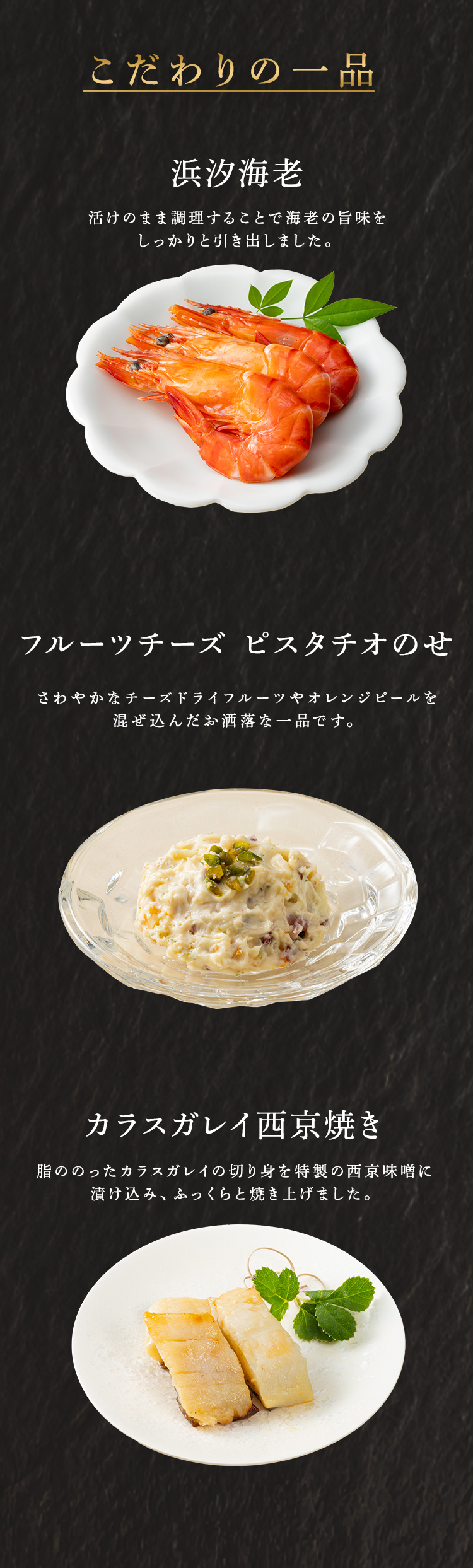 柔らかく焼き上げたカラスガレイの西京焼や赤魚のムニエル、フルーツチーズピスタチオのせなど。