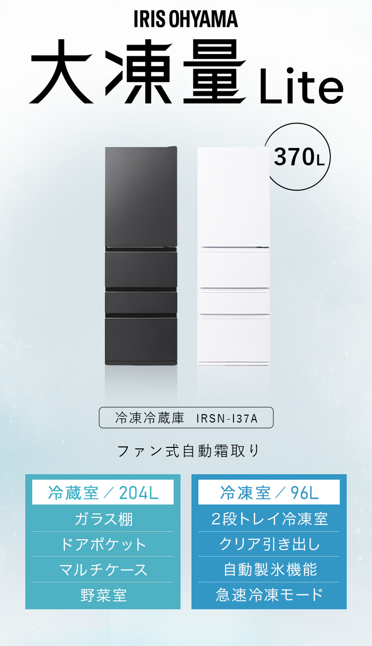 (検索用:冷蔵庫・370L・371L・冷凍冷蔵庫・冷凍室が大きい・2段冷凍室・ファン式・自動霜取り・霜取り不要・野菜室・真ん中・急冷モード・右開き・二人暮らし・家庭用・まとめ買い・大凍量・【HS】・4967576728102・4967576728119・アイリスオーヤマ)