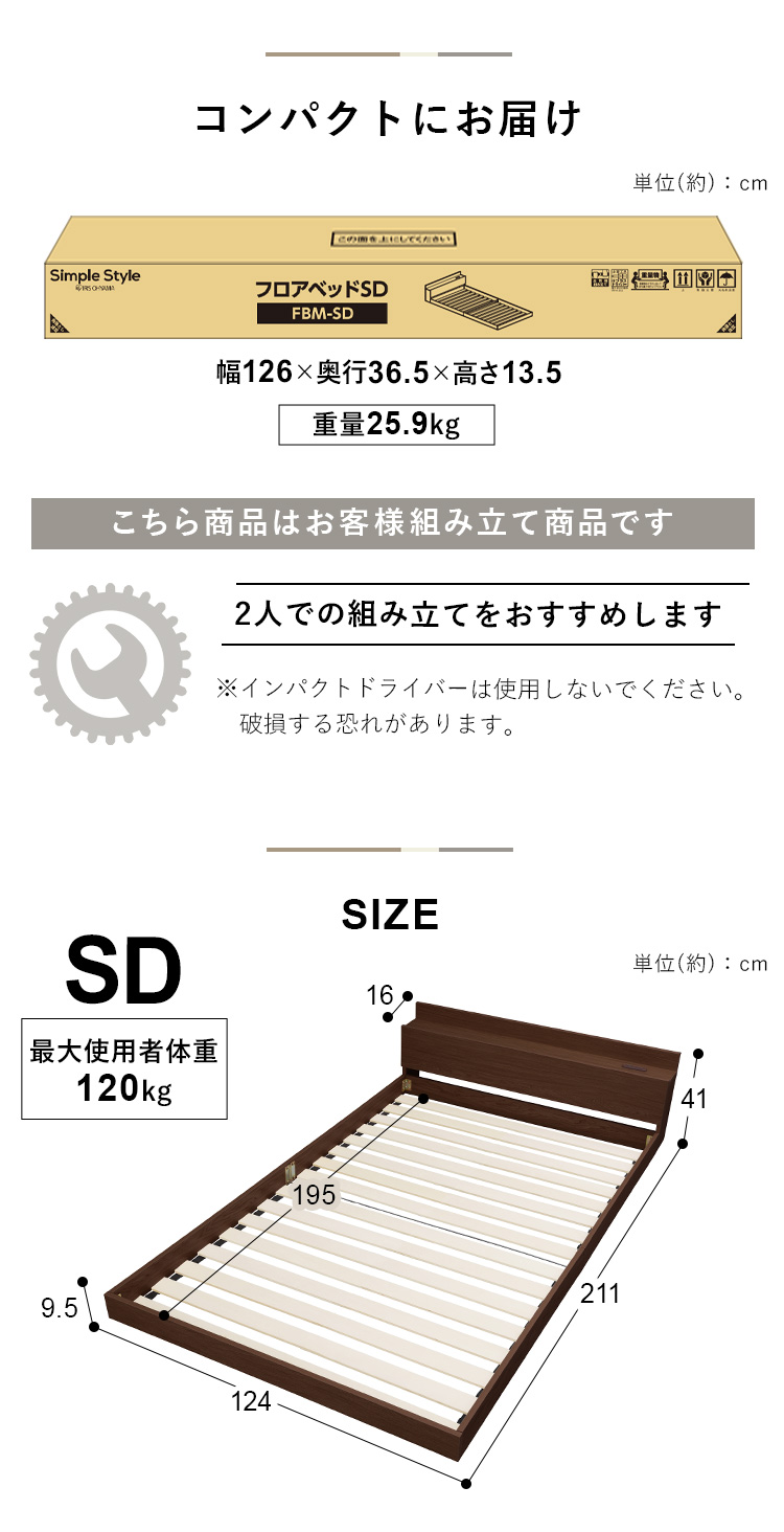 ベッド ベッドフレーム セミダブル フロアベッド ローベッド SD すのこ すのこベッド 布団 ヘッドボード コンセント 単品 FBM-SD アイリスオーヤマ