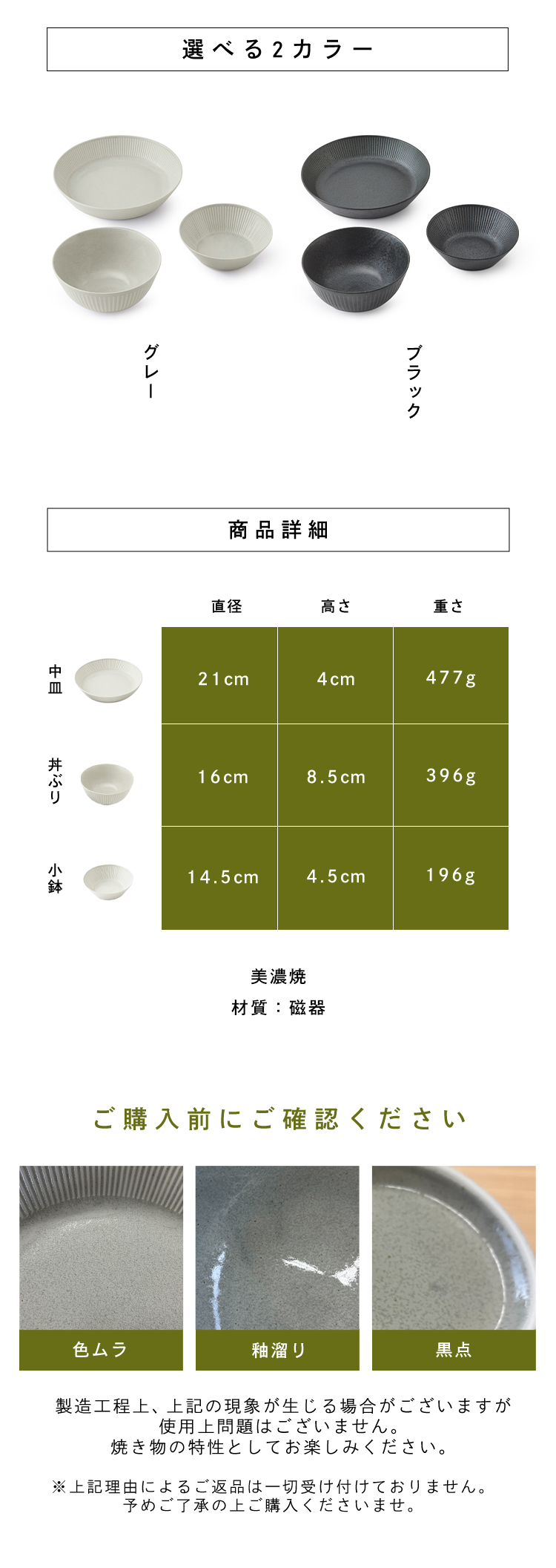 [釉薬による色ムラ・ピンホール(小さい穴)・プリントのかすれ・釉溜り・鉄粉(黒点)・形状のゆがみ]