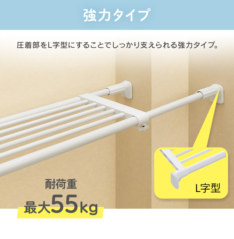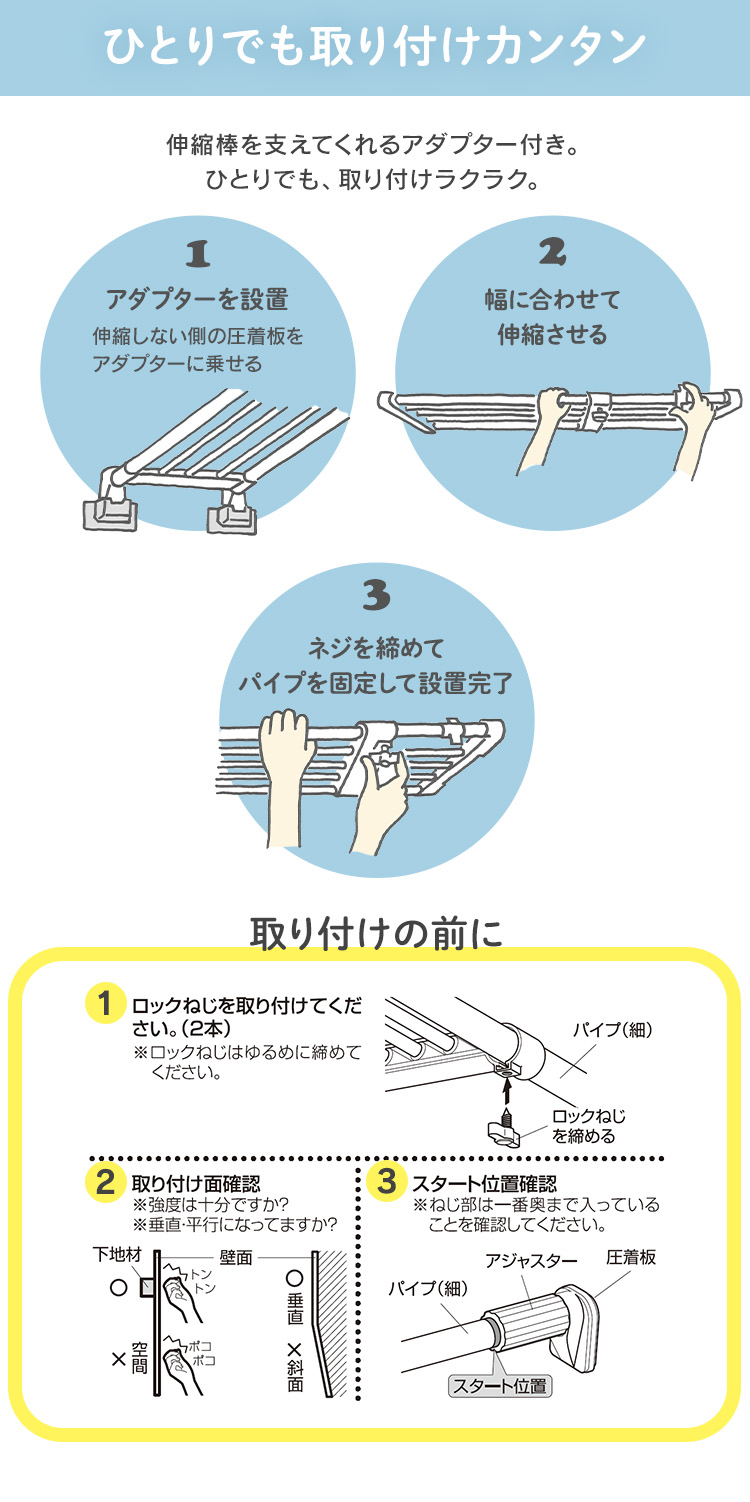 ポールがそれぞれ自由に伸縮するので、段差のある壁にも取り付け可能。