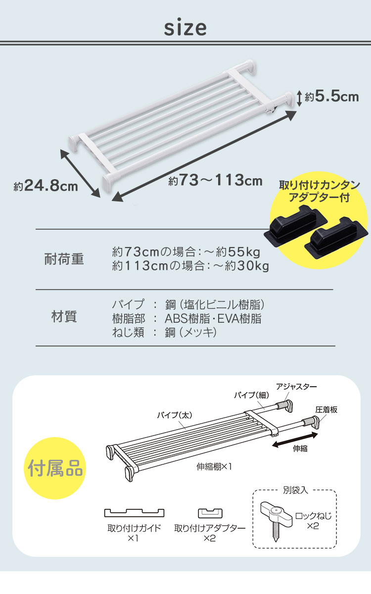 (検索用:突っ張り棚・強力・収納・洗面所・突っ張り棒・ラック・省スペース・脱衣所・ランドリー・洗濯機上・押し入れ・奥行24.8cm・73〜113cm・段差対応・取付簡単・工具不要・4967576699457・4967576699464・アイリスオーヤマ)