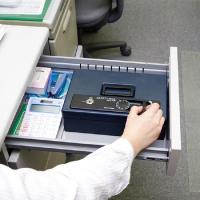 引き出しの中に入れて使用するのに最適な手提げ金庫。金庫上部にダイヤルが付いているので、引き出しに入れたまま操作可能。コインカウンタートレーと札入れのダブルトレータイプ。コインカウンターはスライドして開くので見やすく、シリンダー錠とダイヤル錠のダブルロックでしっかりと中身を保管。