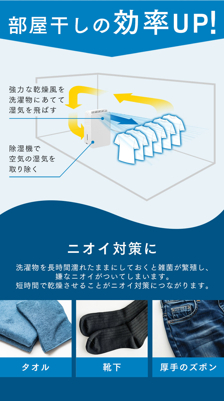 乾きにくい部屋干しもすばやく乾燥するので、生乾きなどのニオイ対策に最適です。