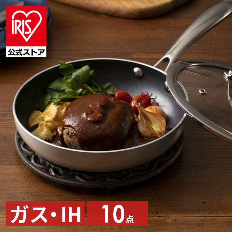 フライパン フライパンセット 10点セット ih ガス アイリスオーヤマ 鍋 片手鍋 両手鍋 卵焼き 20cm 取手一体 おしゃれ ダイヤモンドグレイス DG-SE10
