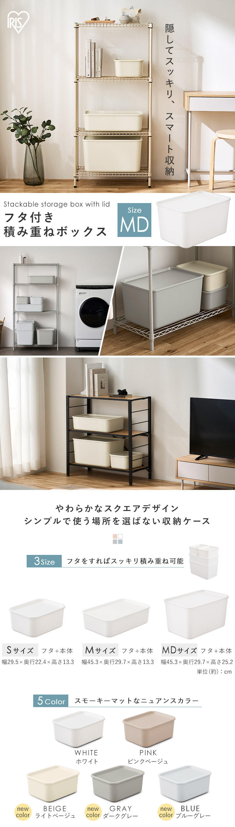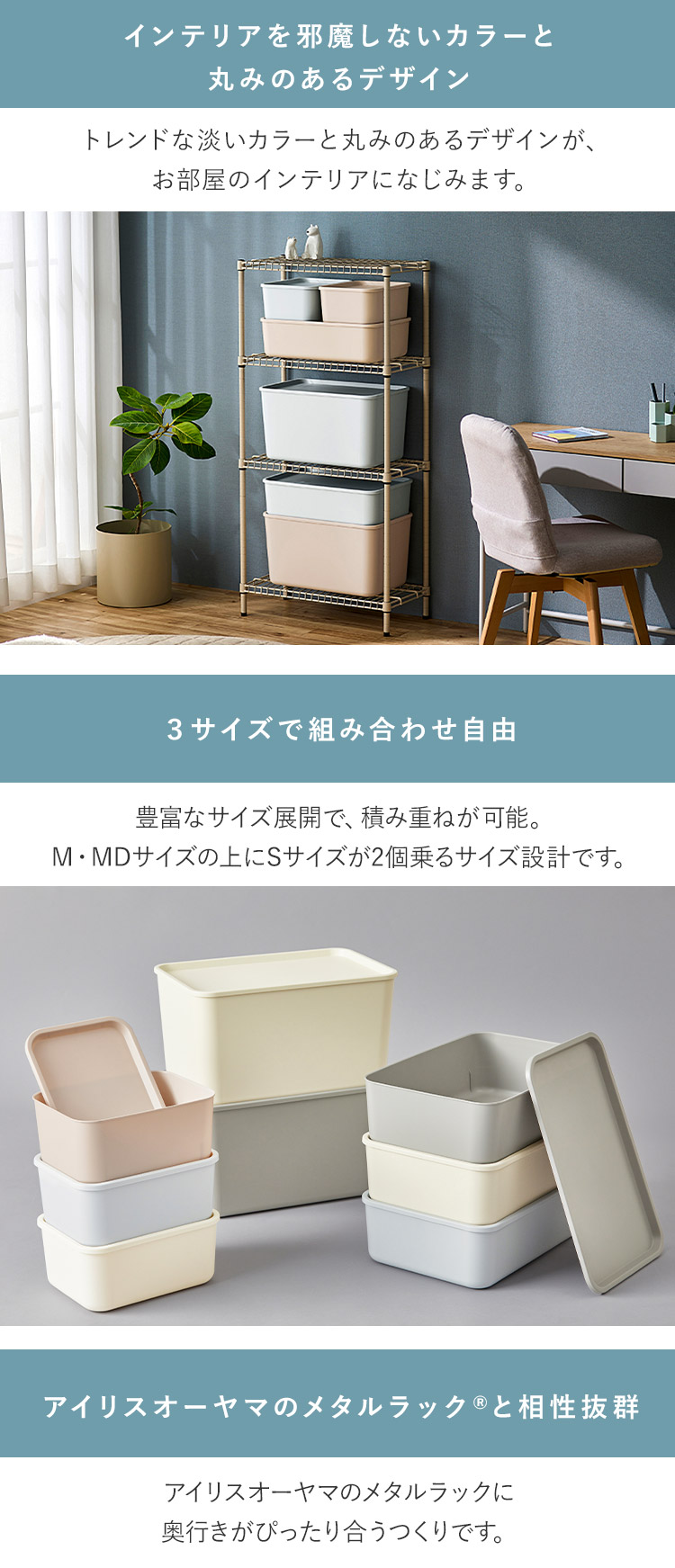 シンプルで丸みのあるやわらかなデザインのフタ付き積み重ねBOX。