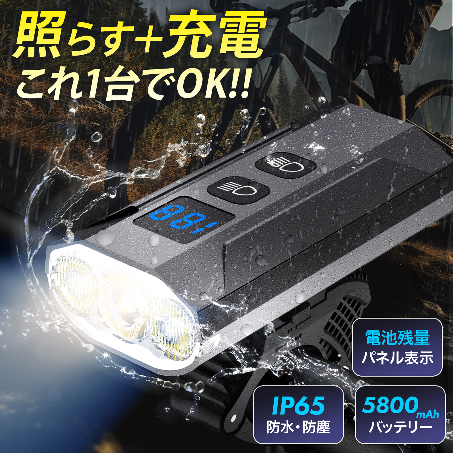 5200mAhの大容量【あすつく当日発送】自転車 ライト 防水 IP65 防塵 USB充電式 電池残量表示 自転車用ライト ヘッドライト 高輝度
