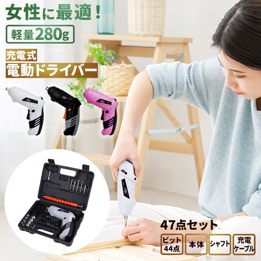 電動ドライバー 女性にも使いやすい最軽量280g 47点セット セット 小型 USB あすつくで最短翌日到着 充電式 変形 ビットセット
