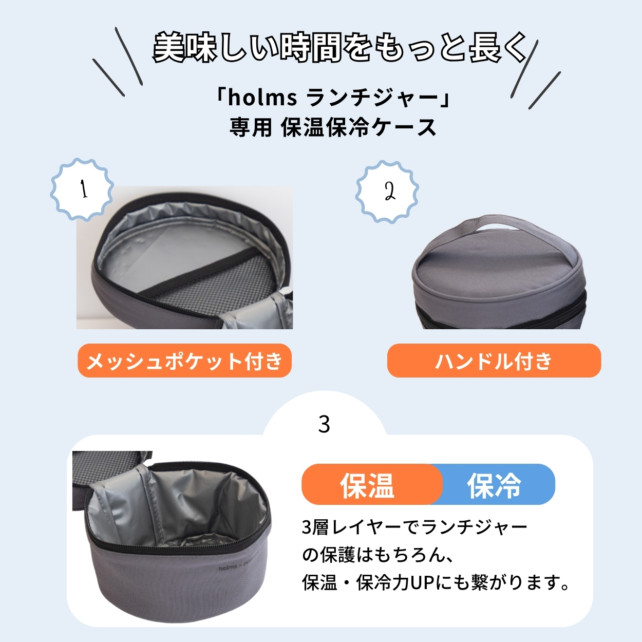 「シービージャパン holms ランチジャー」専用の保温・保冷ポーチは、ランチジャーをさらに使いやすくするために設計されたアイテムです。620mlと850mlのサイズに対応しており、ランチジャーをしっかり保護し、保温・保冷効果を高めます。