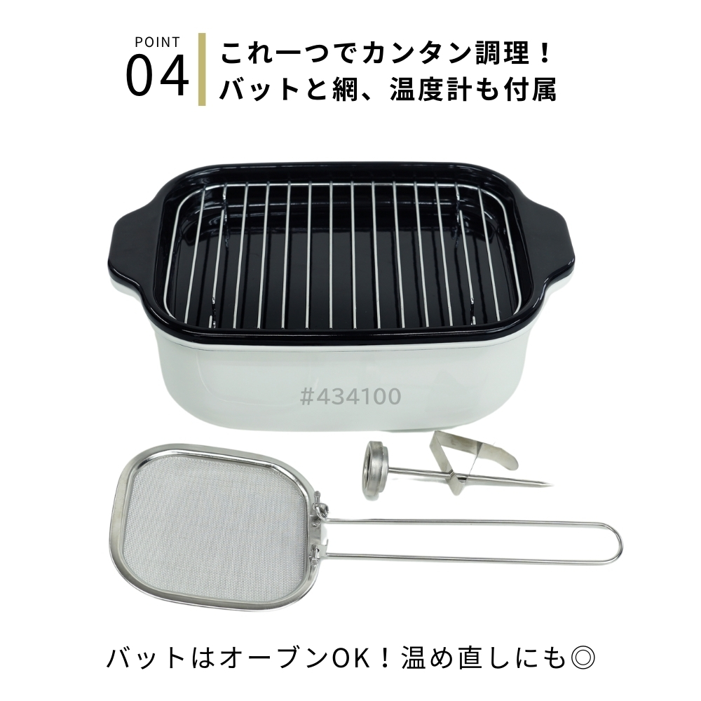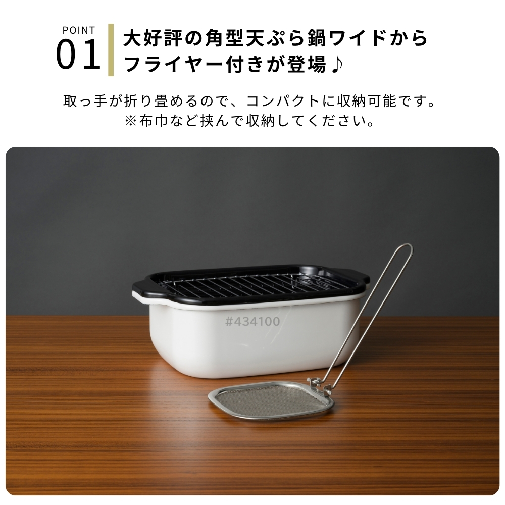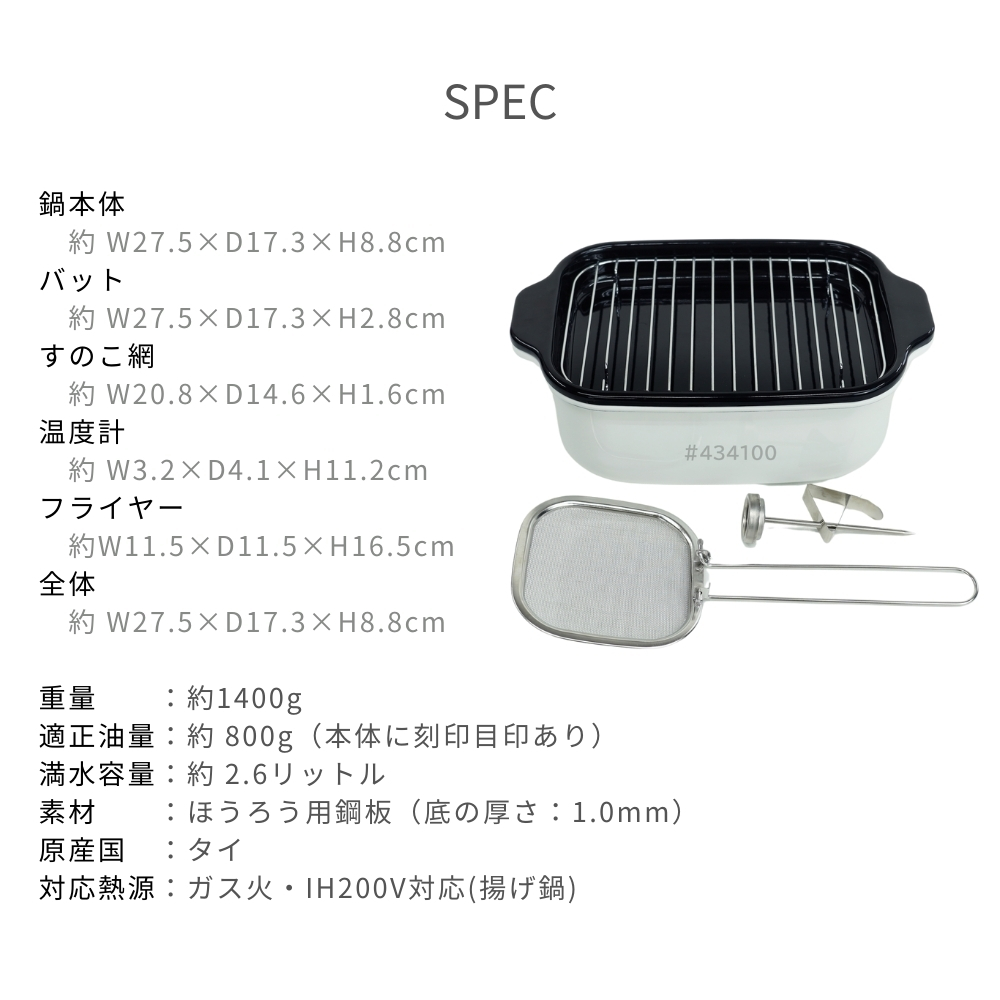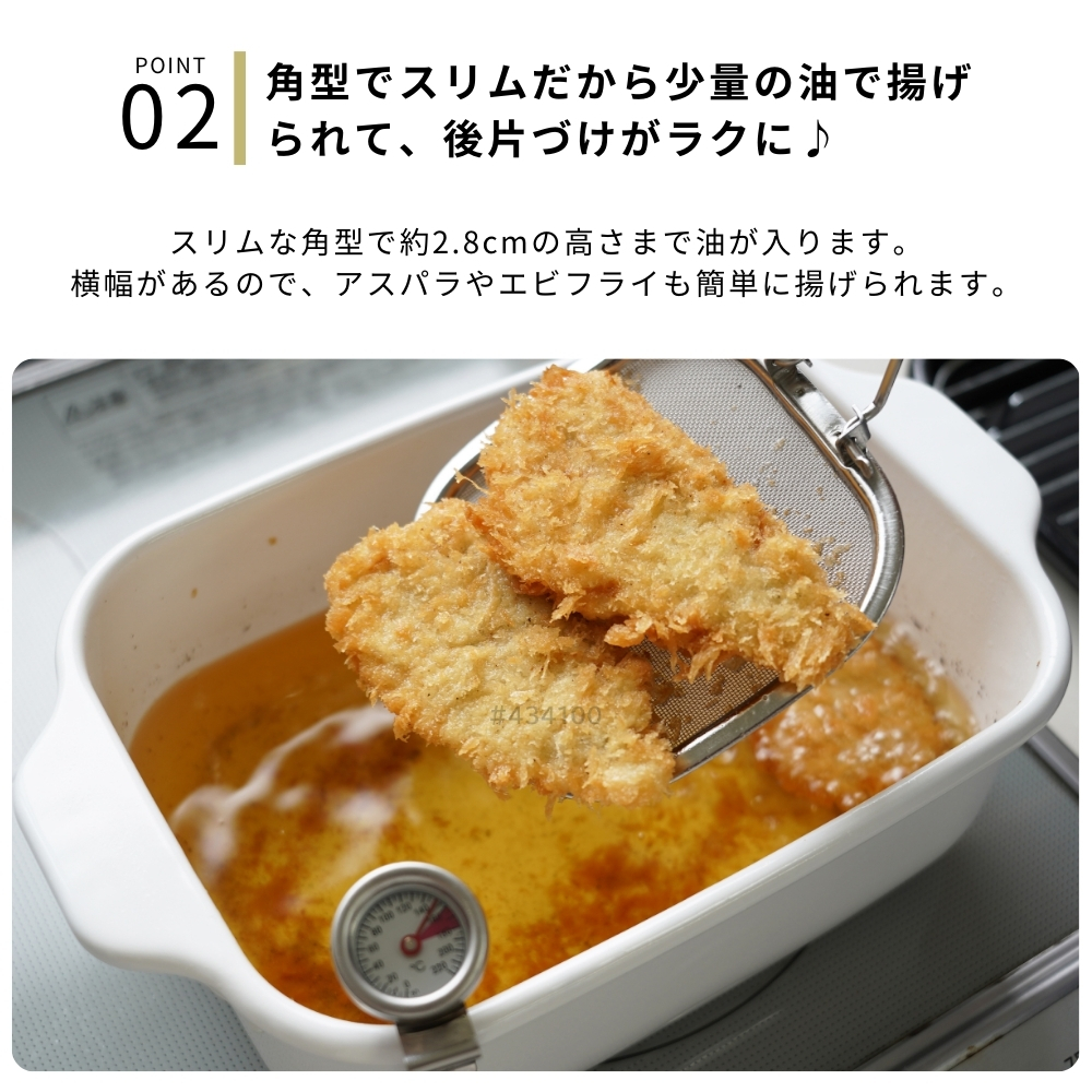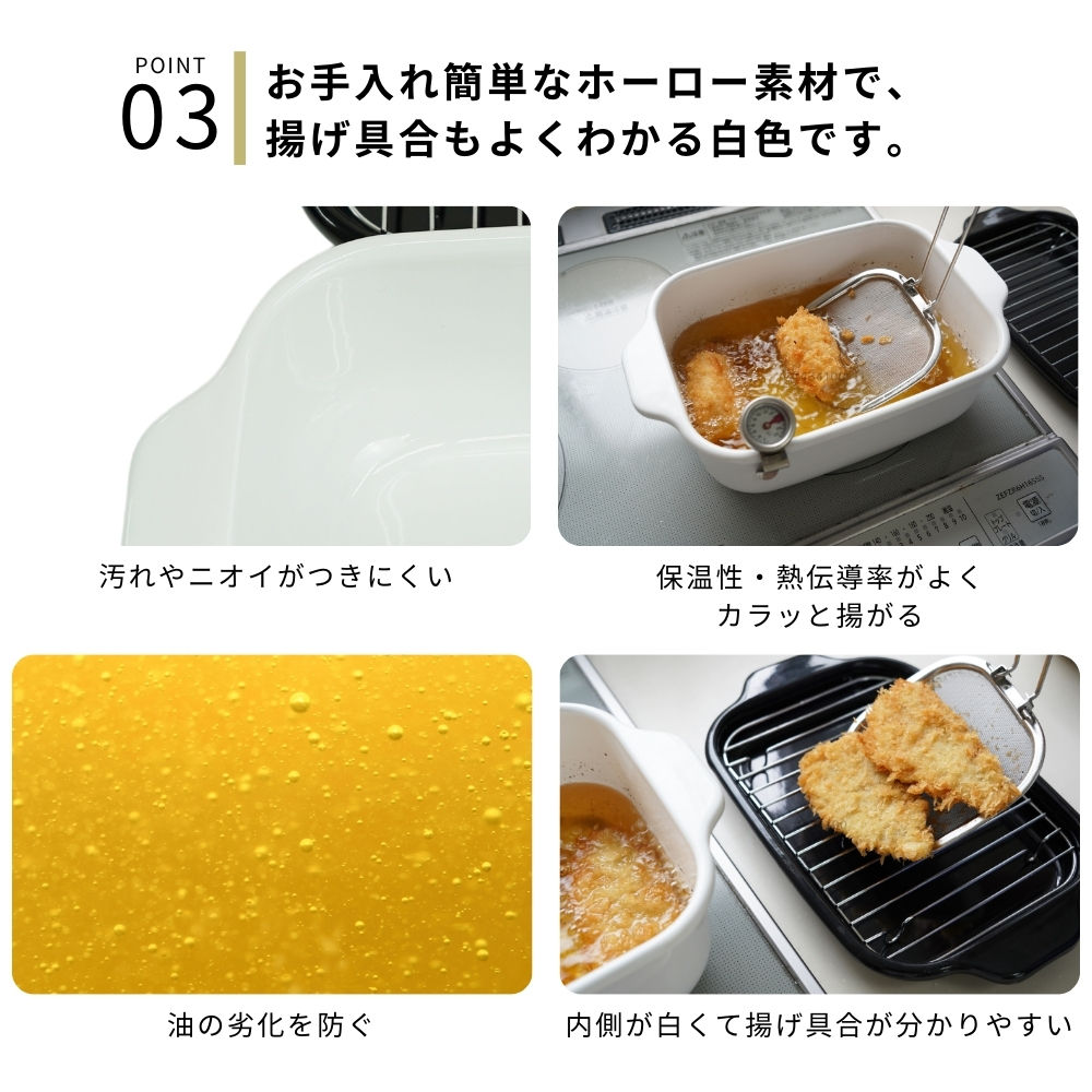 | 商品名: 富士ホーロー 角型 天ぷら鍋 ワイド フライヤーネット 温度計付き スノコ網 TP-22KN.W IH対応 ガス火 ホーロー 四角 少ない油 揚げざる -商品説明- 角型天ぷら鍋 ワイド×フライヤーネット・温度計・スノコ網 人気の角型天ぷら鍋ワイドにフライヤー付きが登場! 大人気の角型天ぷら鍋ワイドにフライヤー付きが登場しました。 フライヤーは折り畳んで収納できる優れもの。 便利なバットとすのこ網もセットに☆ 防水型の温度計も付いていて全て重ねてコンパクトに収納出来ます。 取っ手が折り畳めるので、コンパクトに収納可能です。 ※布巾など挟んで収納してください。 スリムな角型で約2.8cmの高さまで油が入ります。 横幅があるので、アスパラやエビフライも簡単に揚げられます。 付け合わせやお弁当のちょっと上げにも◎ お手入れ簡単なホーロー素材で、揚げ具合もよくわかる白色です。 バットはオーブンOK!温め直しにも◎ コンパクトに収納でき、使わない時もすっきり! -特徴・品質- ・耐久性と熱伝導性に優れたホーロー用鋼板を使用。 ・白色の内面で揚げ具合が見やすく、調理がスムーズ。 ・防水型の温度計は丸洗い可能で使いやすさ抜群。 ・ホーロー特有の滑らかな表面で汚れが付きにくくお手入れ簡単。 -仕様- ・鍋本体サイズ:約 W27.5×D17.3×H8.8cm ・バットサイズ:約 W27.5×D17.3×H2.8cm ・すのこ網サイズ:約 W20.8×D14.6×H1.6cm ・フライヤーサイズ:約 W11.5×D11.5×H16.5cm ・適正油量:約800g(本体刻印目印あり) ・満水容量:約2.6リットル ・重量:約1400g ・素材:ほうろう用鋼板(底の厚さ1.0mm) ・原産国:タイ ・IH200V対応/ガス火対応 ・オーブン使用可(バットのみ) -機能- ・少量の油でも効率よく調理可能な設計。 ・折り畳み可能な取っ手でコンパクト収納が可能。 ・フライヤーネットやスノコ網が揚げ物の油切りをサポート。 ・防水型温度計で温度管理が簡単。 -使用・手入れについて- ※琺瑯は製造上、製品の端部に釉薬が定着しにくく、端部分が黒く見えることがあります。これは一層目の琺瑯面で、不良や不具合ではありません。 ※琺瑯を焼成炉で焼く際に、機種によってはふちの裏に針をかけて吊るすため、ふちの裏に「吊り跡」がある場合がございます。製造工程上その針跡がつきますが不良ではありません。 ※琺瑯を焼成炉で焼きあげる際にすすなどが付着して、内面・外面にある黒い点があることがありますが、衛生上・ご使用上問題ございません。 ※ガスコンロにてご使用の場合、五徳の中央に置いて安定することを予め確認してください。 ※五徳との相性により不安定な場合は、もち網等を置き、安定性を確保してからご使用ください。 ※油の温度を200℃以上に上昇させないでください。 ※油を適正油量以上入れないでください。また、500ml未満の油量で調理しないでください。 ※付属のバットや他の蓋などを本体にのせないでください。 ※加熱調理中、調理の直後は、本体や取っ手部分が高熱となりますので、必ずミトン等を使用して下さい。 ※電子レンジでは使用できません。 ※ストーブの上では使用しないでください。 ※炒め物に使用しないでください。 ※縁まで水などを満たした状態で使用しないでください。 ※IH調理器のご使用際は必ず中レベル以下からご使用ください。 ※その他お手入れ方法や注意事項などいずれも商品と同梱しております「取扱説明書」を必ずお読みの上、お読みになった後は必ず保管して下さい。 -注意事項- ・商品の色はできる限り実物に近づけていますが、ディスプレイ設定や撮影条件により色味が異なる場合があります。ご了承ください。 ・ご注文のタイミングや内容により、購入後のキャンセルや修正が制限される場合があります。 ・同時に複数のご注文があった場合、システム上の遅延により在庫がないにも関わらず購入できてしまう場合があります。そのような場合は速やかにメールでお知らせいたします。 |