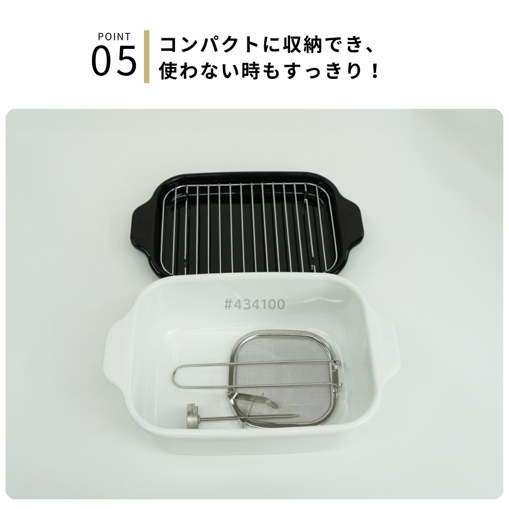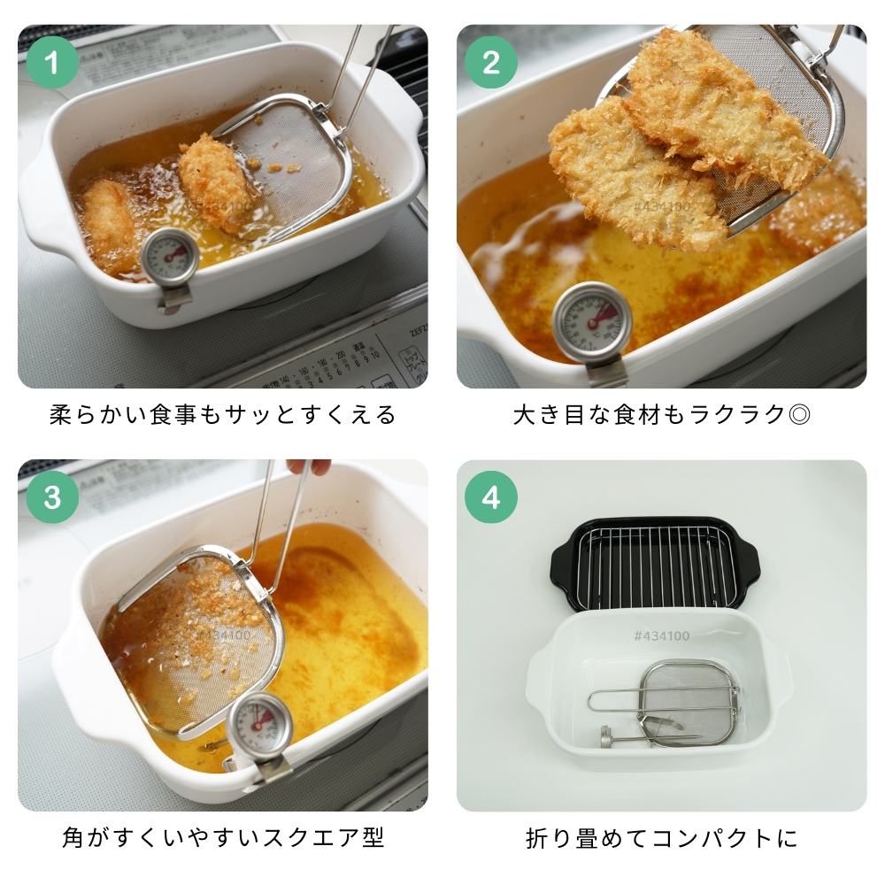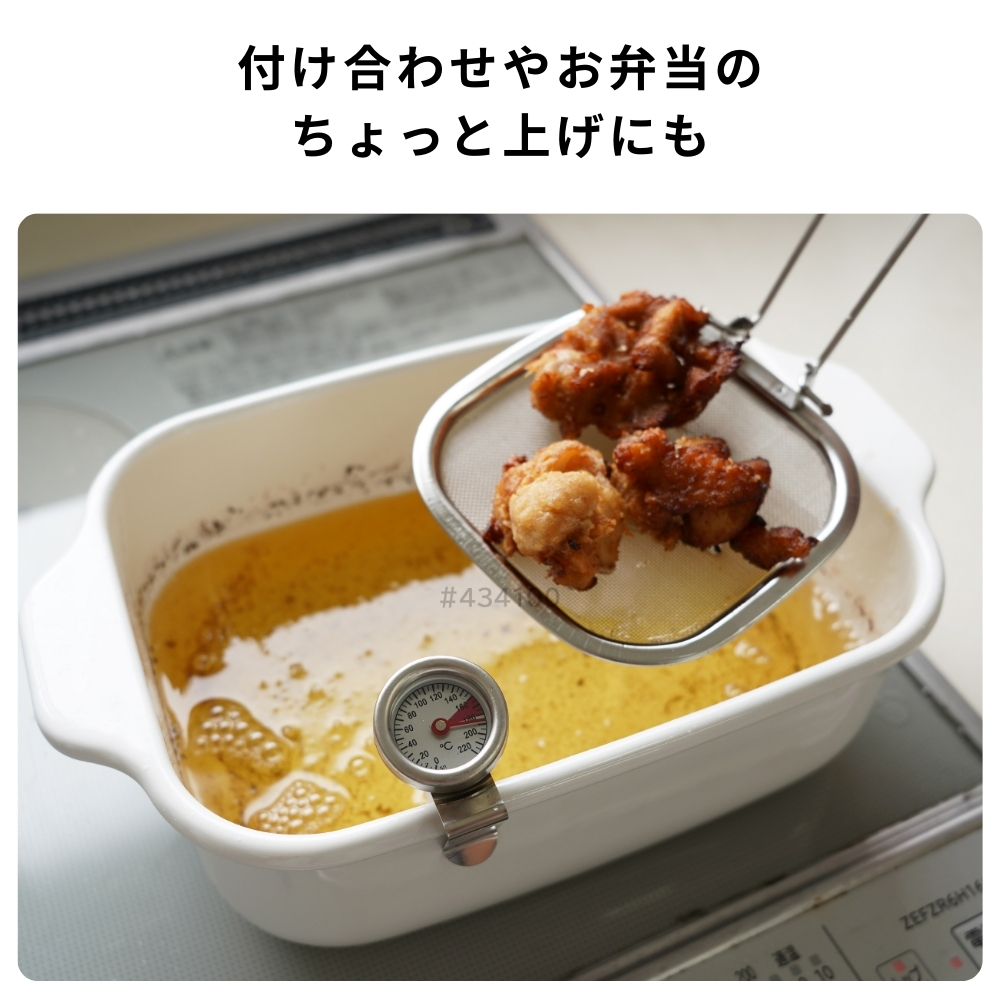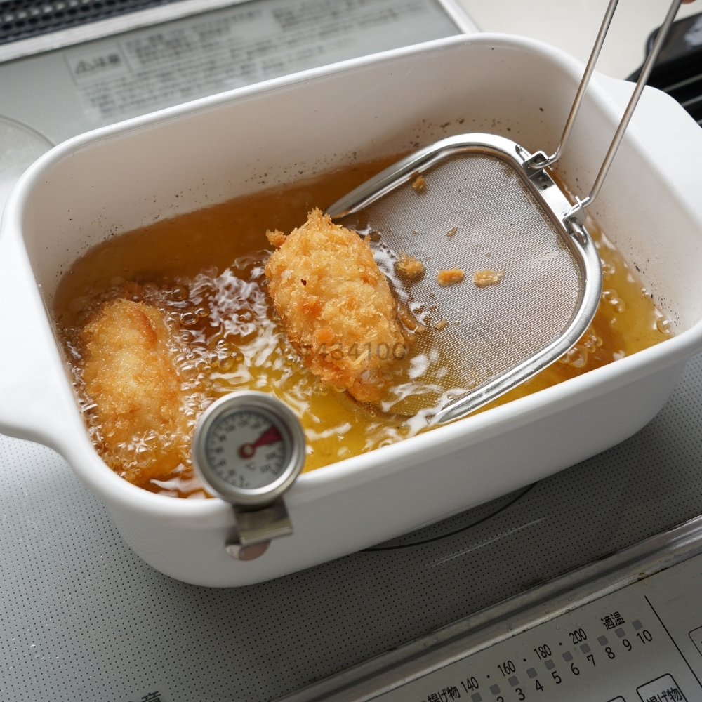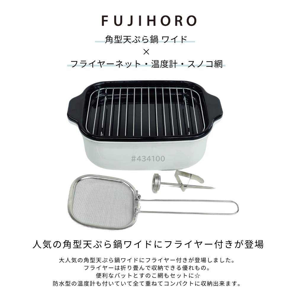 | 商品名: 富士ホーロー 角型 天ぷら鍋 ワイド フライヤーネット 温度計付き スノコ網 TP-22KN.W IH対応 ガス火 ホーロー 四角 少ない油 揚げざる -商品説明- 角型天ぷら鍋 ワイド×フライヤーネット・温度計・スノコ網 人気の角型天ぷら鍋ワイドにフライヤー付きが登場! 大人気の角型天ぷら鍋ワイドにフライヤー付きが登場しました。 フライヤーは折り畳んで収納できる優れもの。 便利なバットとすのこ網もセットに☆ 防水型の温度計も付いていて全て重ねてコンパクトに収納出来ます。 取っ手が折り畳めるので、コンパクトに収納可能です。 ※布巾など挟んで収納してください。 スリムな角型で約2.8cmの高さまで油が入ります。 横幅があるので、アスパラやエビフライも簡単に揚げられます。 付け合わせやお弁当のちょっと上げにも◎ お手入れ簡単なホーロー素材で、揚げ具合もよくわかる白色です。 バットはオーブンOK!温め直しにも◎ コンパクトに収納でき、使わない時もすっきり! -特徴・品質- ・耐久性と熱伝導性に優れたホーロー用鋼板を使用。 ・白色の内面で揚げ具合が見やすく、調理がスムーズ。 ・防水型の温度計は丸洗い可能で使いやすさ抜群。 ・ホーロー特有の滑らかな表面で汚れが付きにくくお手入れ簡単。 -仕様- ・鍋本体サイズ:約 W27.5×D17.3×H8.8cm ・バットサイズ:約 W27.5×D17.3×H2.8cm ・すのこ網サイズ:約 W20.8×D14.6×H1.6cm ・フライヤーサイズ:約 W11.5×D11.5×H16.5cm ・適正油量:約800g(本体刻印目印あり) ・満水容量:約2.6リットル ・重量:約1400g ・素材:ほうろう用鋼板(底の厚さ1.0mm) ・原産国:タイ ・IH200V対応/ガス火対応 ・オーブン使用可(バットのみ) -機能- ・少量の油でも効率よく調理可能な設計。 ・折り畳み可能な取っ手でコンパクト収納が可能。 ・フライヤーネットやスノコ網が揚げ物の油切りをサポート。 ・防水型温度計で温度管理が簡単。 -使用・手入れについて- ※琺瑯は製造上、製品の端部に釉薬が定着しにくく、端部分が黒く見えることがあります。これは一層目の琺瑯面で、不良や不具合ではありません。 ※琺瑯を焼成炉で焼く際に、機種によってはふちの裏に針をかけて吊るすため、ふちの裏に「吊り跡」がある場合がございます。製造工程上その針跡がつきますが不良ではありません。 ※琺瑯を焼成炉で焼きあげる際にすすなどが付着して、内面・外面にある黒い点があることがありますが、衛生上・ご使用上問題ございません。 ※ガスコンロにてご使用の場合、五徳の中央に置いて安定することを予め確認してください。 ※五徳との相性により不安定な場合は、もち網等を置き、安定性を確保してからご使用ください。 ※油の温度を200℃以上に上昇させないでください。 ※油を適正油量以上入れないでください。また、500ml未満の油量で調理しないでください。 ※付属のバットや他の蓋などを本体にのせないでください。 ※加熱調理中、調理の直後は、本体や取っ手部分が高熱となりますので、必ずミトン等を使用して下さい。 ※電子レンジでは使用できません。 ※ストーブの上では使用しないでください。 ※炒め物に使用しないでください。 ※縁まで水などを満たした状態で使用しないでください。 ※IH調理器のご使用際は必ず中レベル以下からご使用ください。 ※その他お手入れ方法や注意事項などいずれも商品と同梱しております「取扱説明書」を必ずお読みの上、お読みになった後は必ず保管して下さい。 -注意事項- ・商品の色はできる限り実物に近づけていますが、ディスプレイ設定や撮影条件により色味が異なる場合があります。ご了承ください。 ・ご注文のタイミングや内容により、購入後のキャンセルや修正が制限される場合があります。 ・同時に複数のご注文があった場合、システム上の遅延により在庫がないにも関わらず購入できてしまう場合があります。そのような場合は速やかにメールでお知らせいたします。 |
